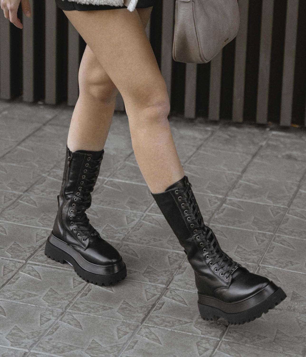 BOSANOVA Botas militares altas con suela track y cordones. Cierre con cremallera interior.