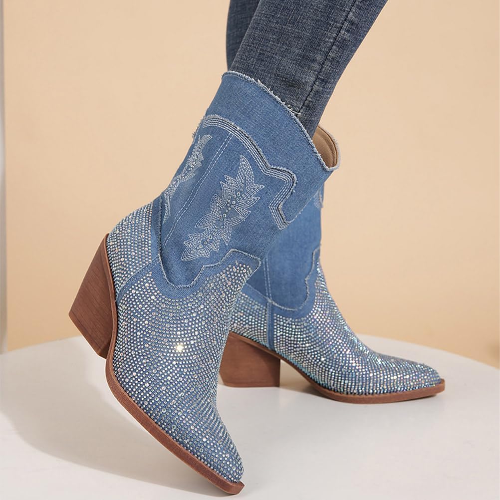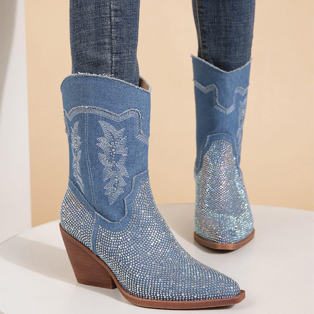 Botas Cowboy Mujer con Tacon Altas Botas Invierno Azul Botas Cowboy Mujer Botas Camperas Cowboy Boots Botas de Vaquero Mujer Tacón de Bloque Moda con Strass Brillante Chic