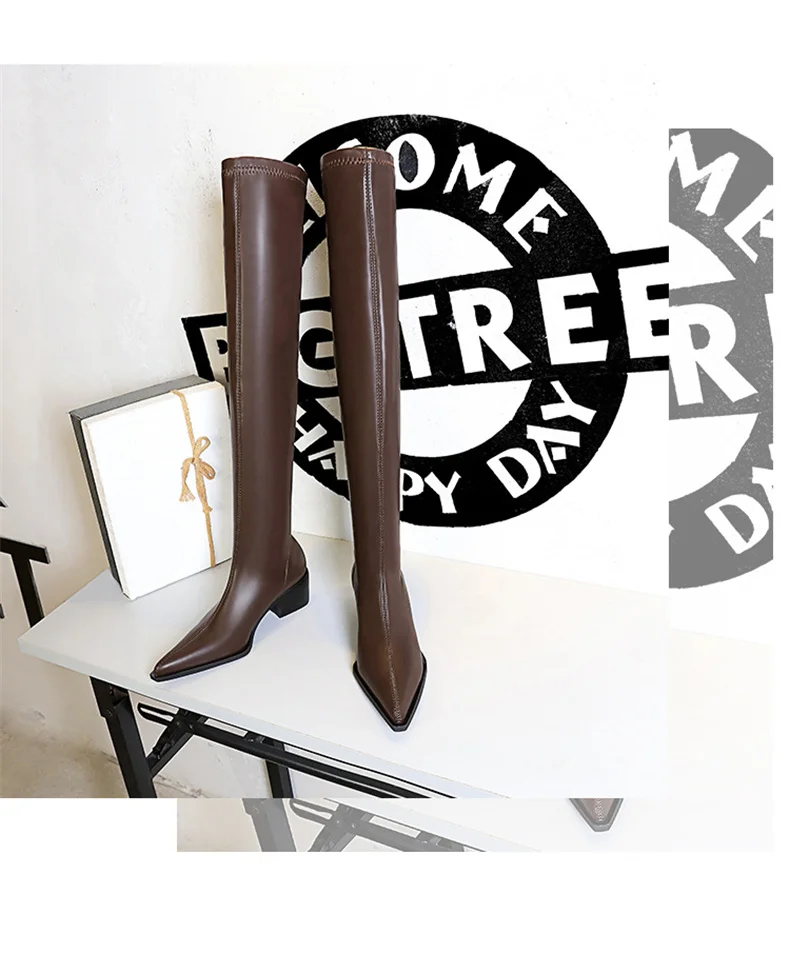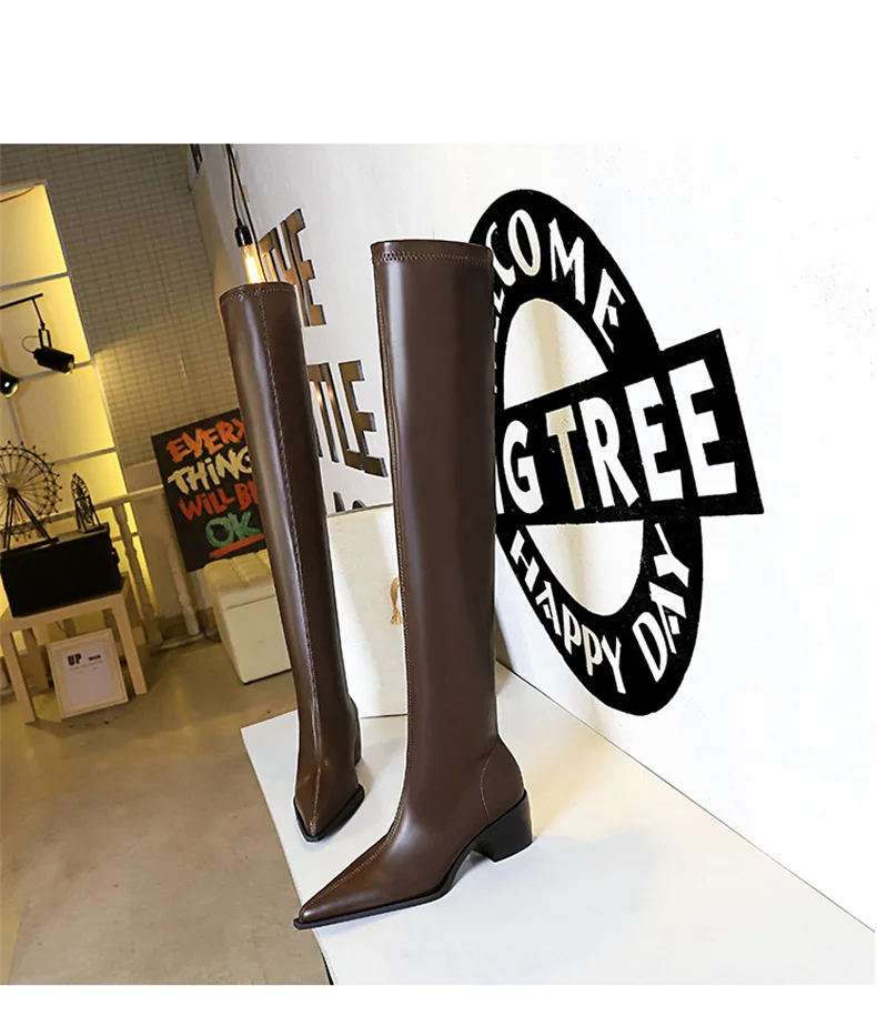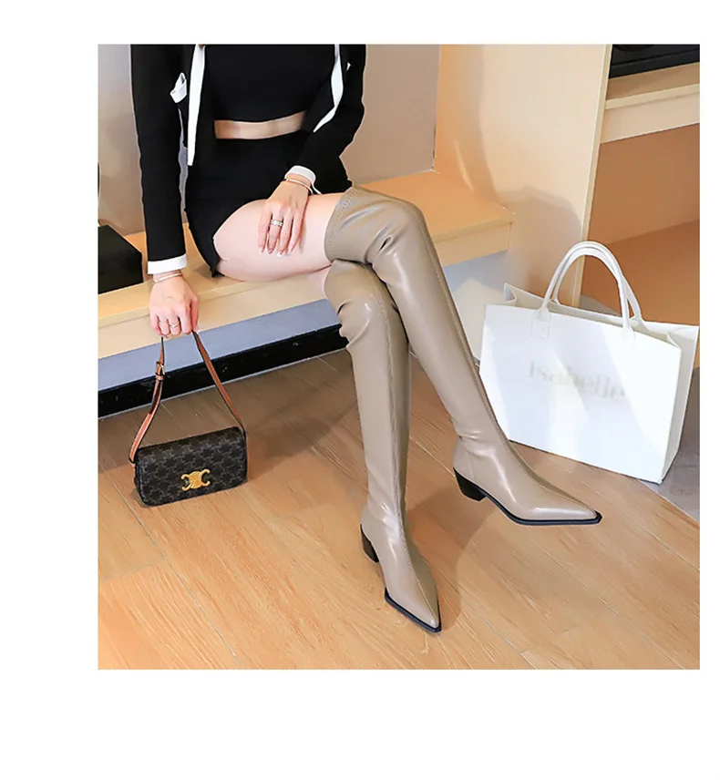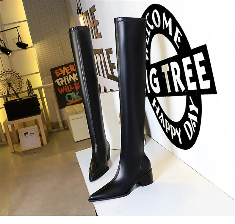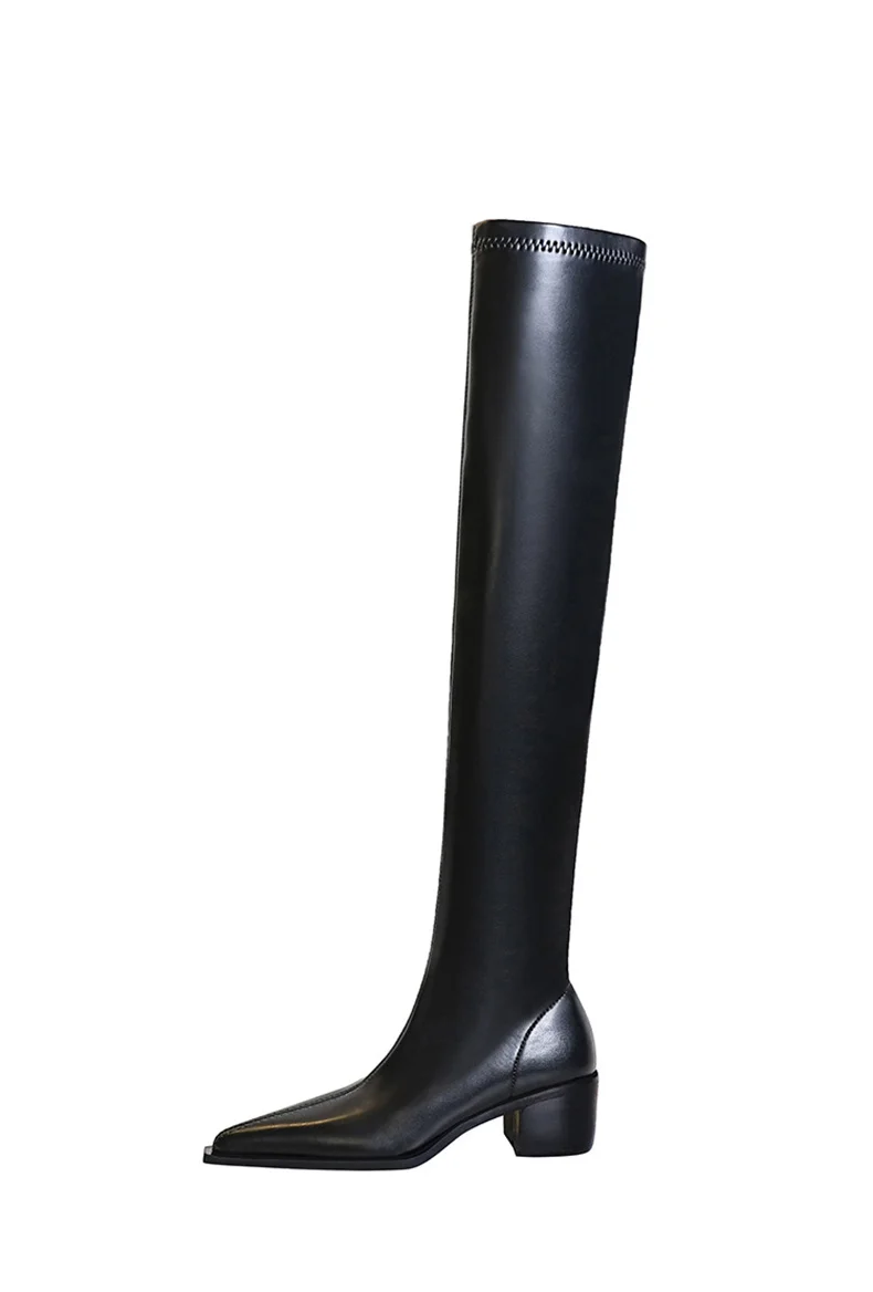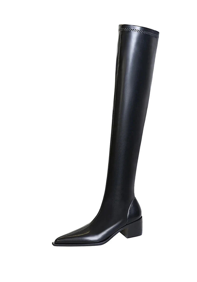 Botas de punta estrecha para mujer, zapatos por encima de la rodilla con costura sin cordones de cuero PU, tacón cuadrado, estilo callejero, color negro, Otoño, 2024