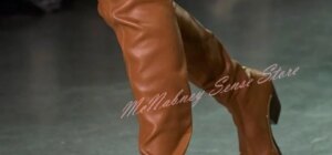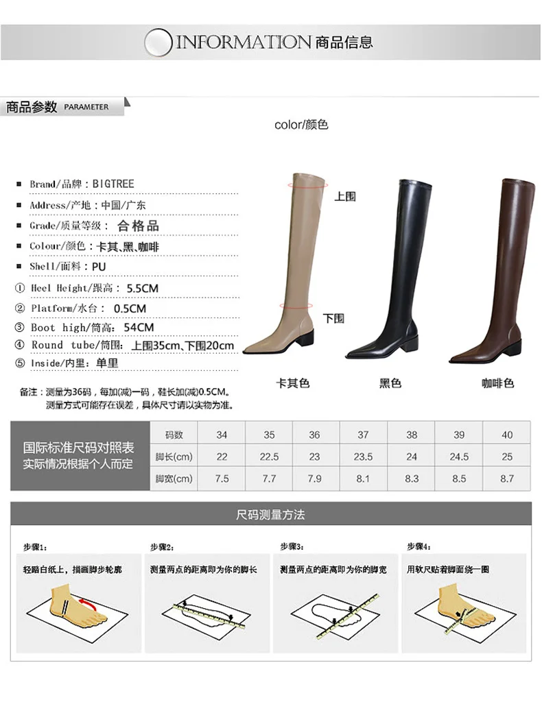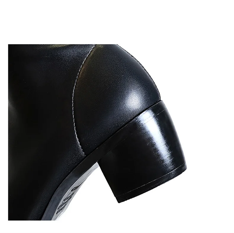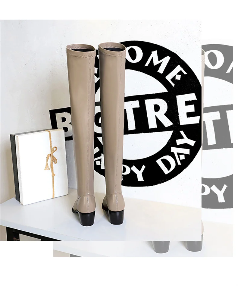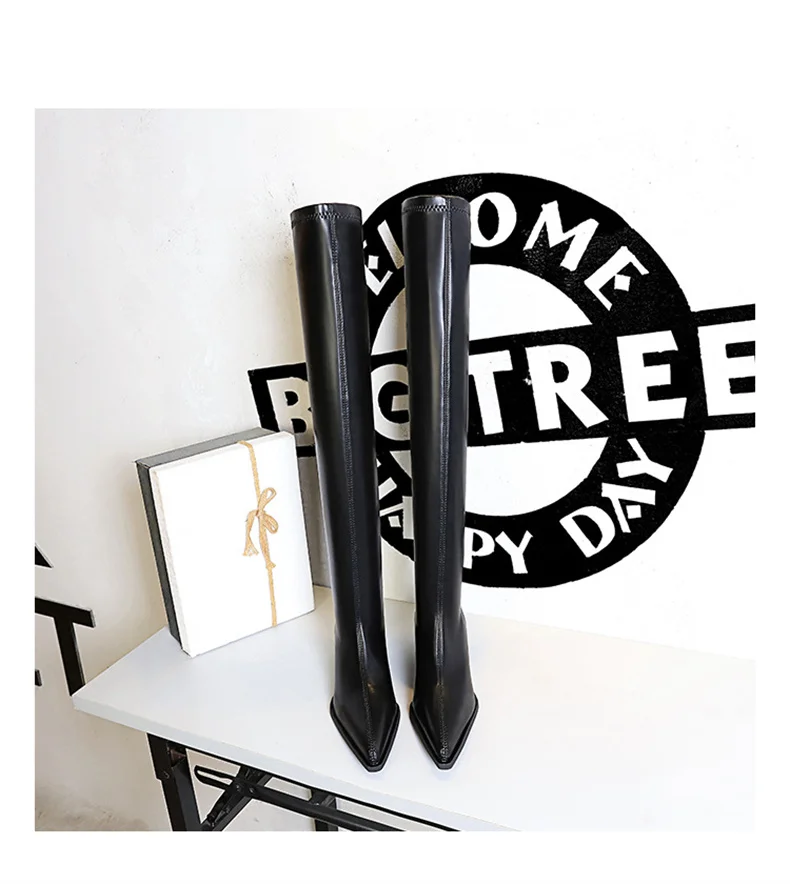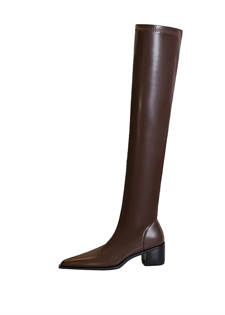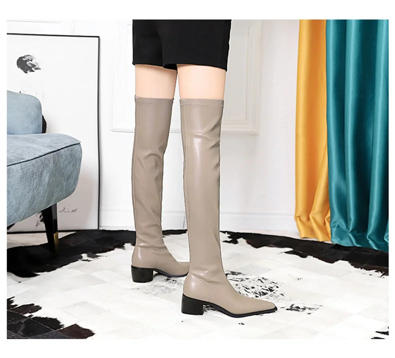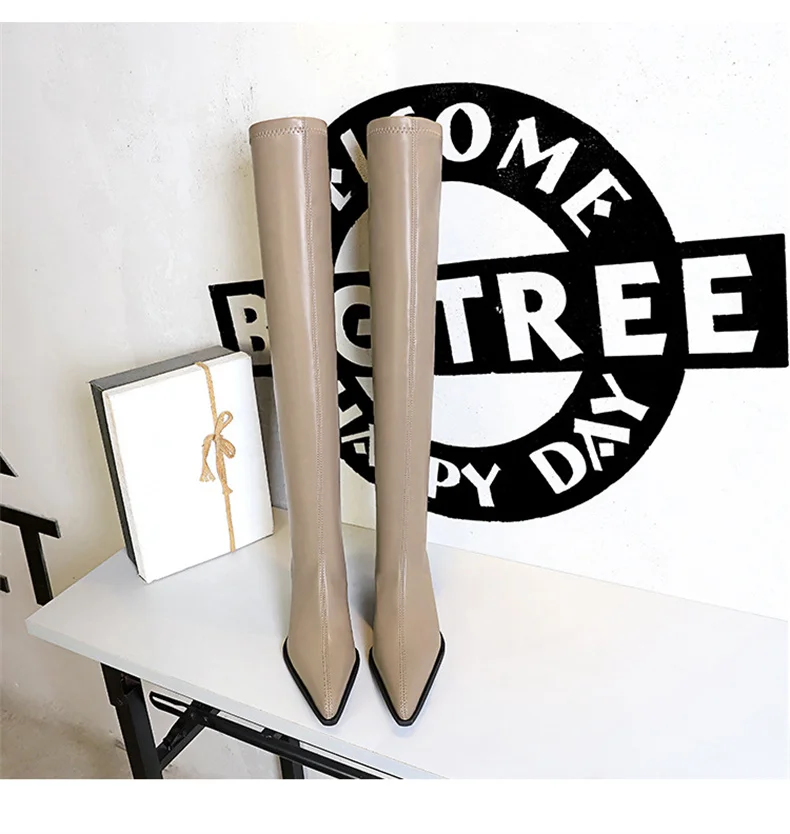 Botas de punta estrecha para mujer, zapatos por encima de la rodilla con costura sin cordones de cuero PU, tacón cuadrado, estilo callejero, color negro, Otoño, 2024