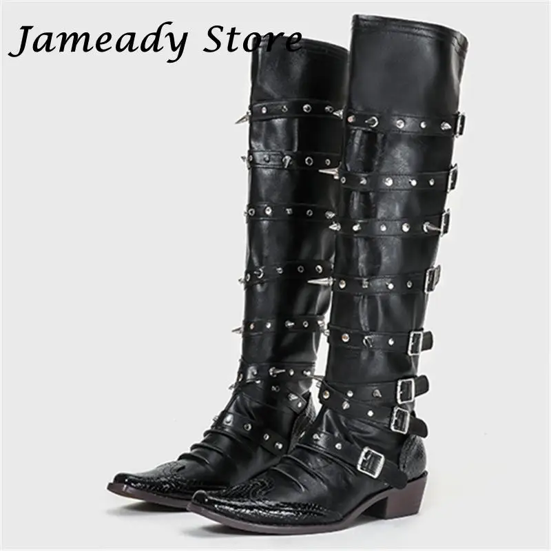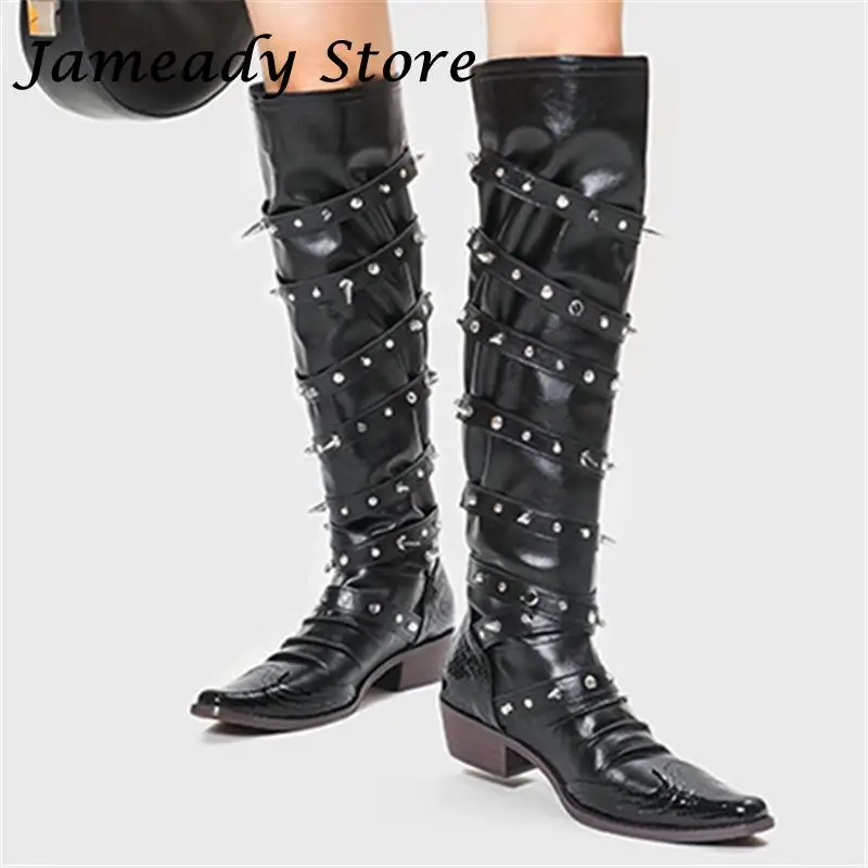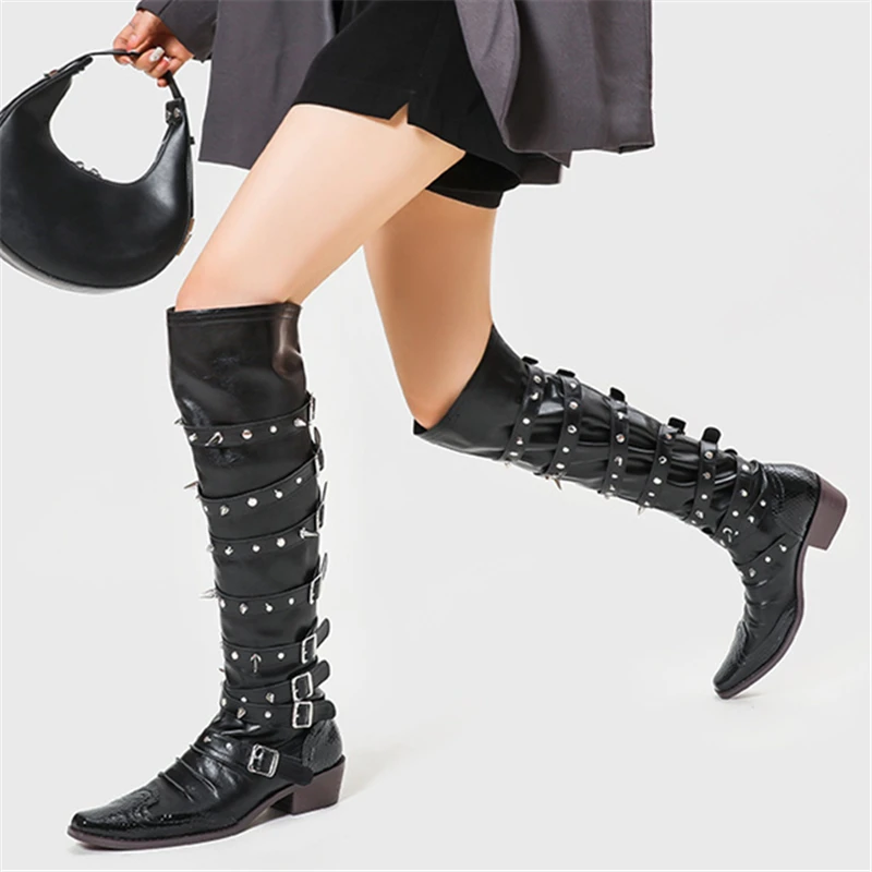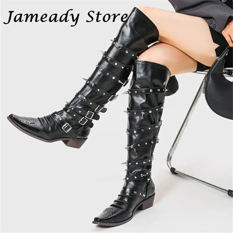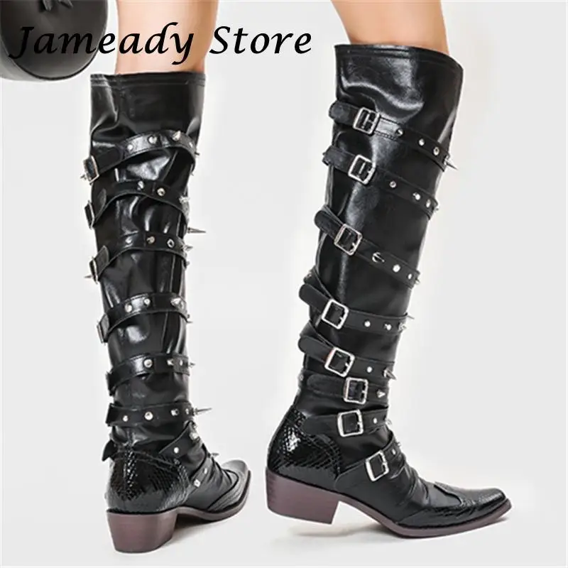 Botas de vaquero occidentales con hebilla de cinturón y remaches para mujer, botas hasta la rodilla, tacón grueso, punta cuadrada, decoración de Metal, estilo Punk, Cool