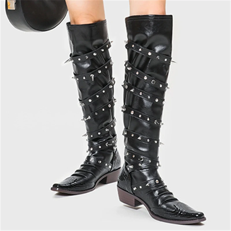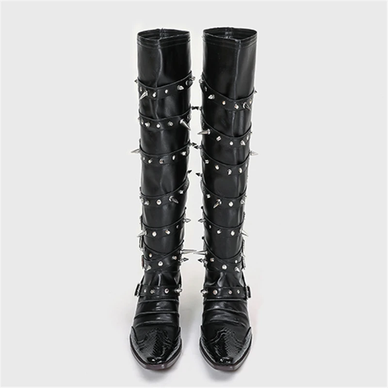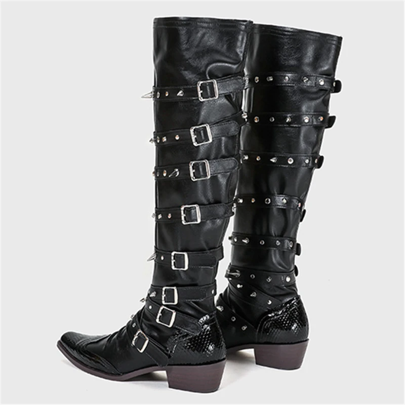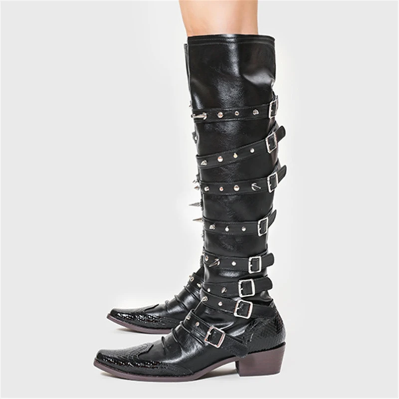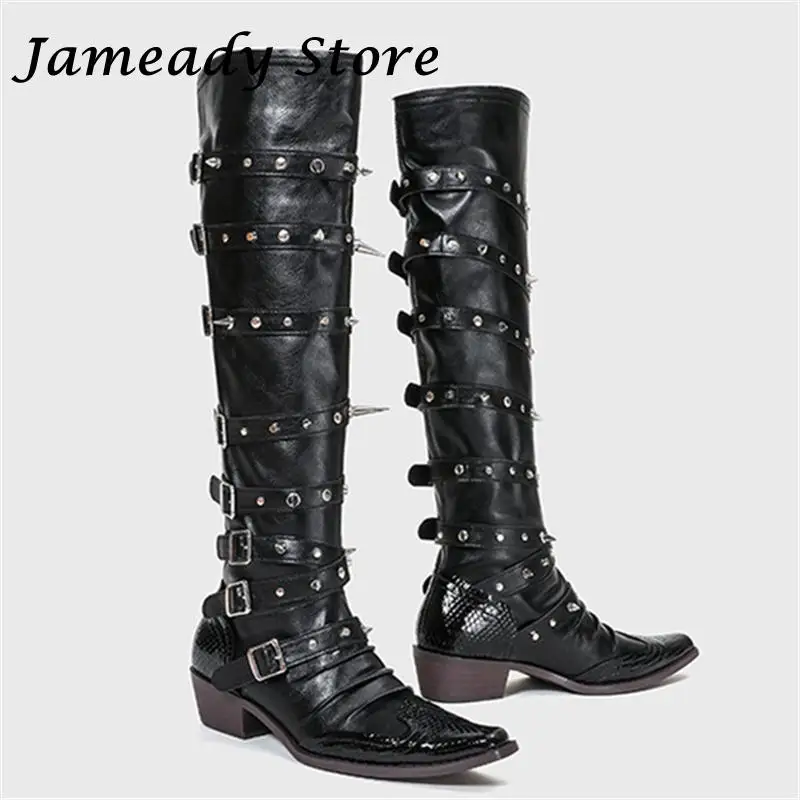 Botas de vaquero occidentales con hebilla de cinturón y remaches para mujer, botas hasta la rodilla, tacón grueso, punta cuadrada, decoración de Metal, estilo Punk, Cool