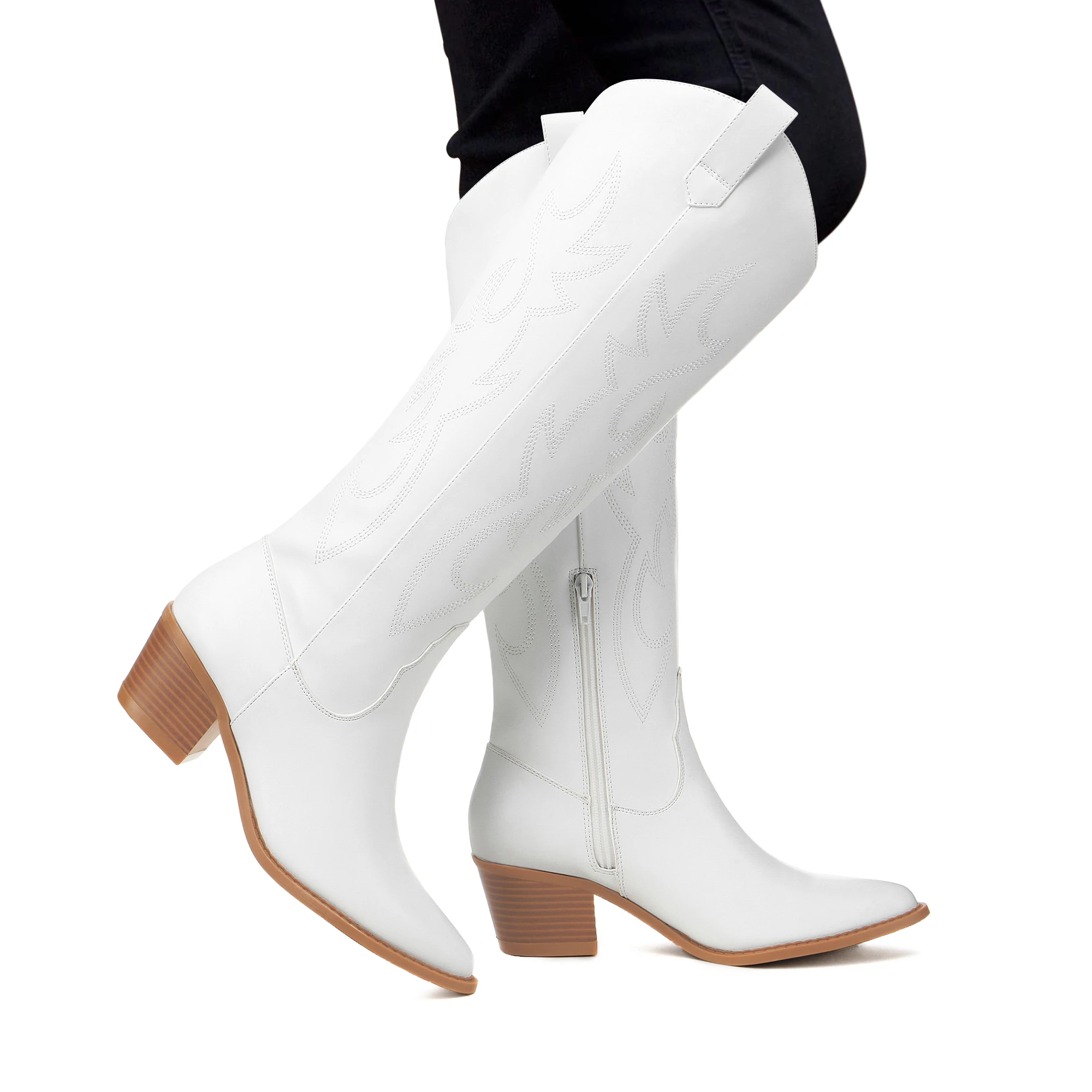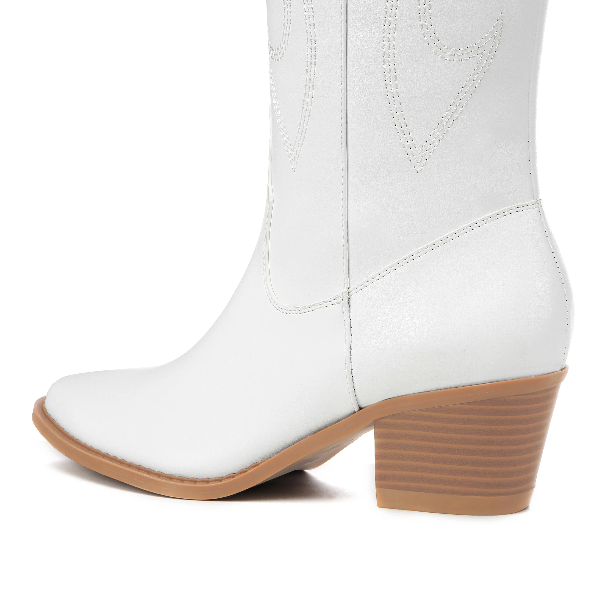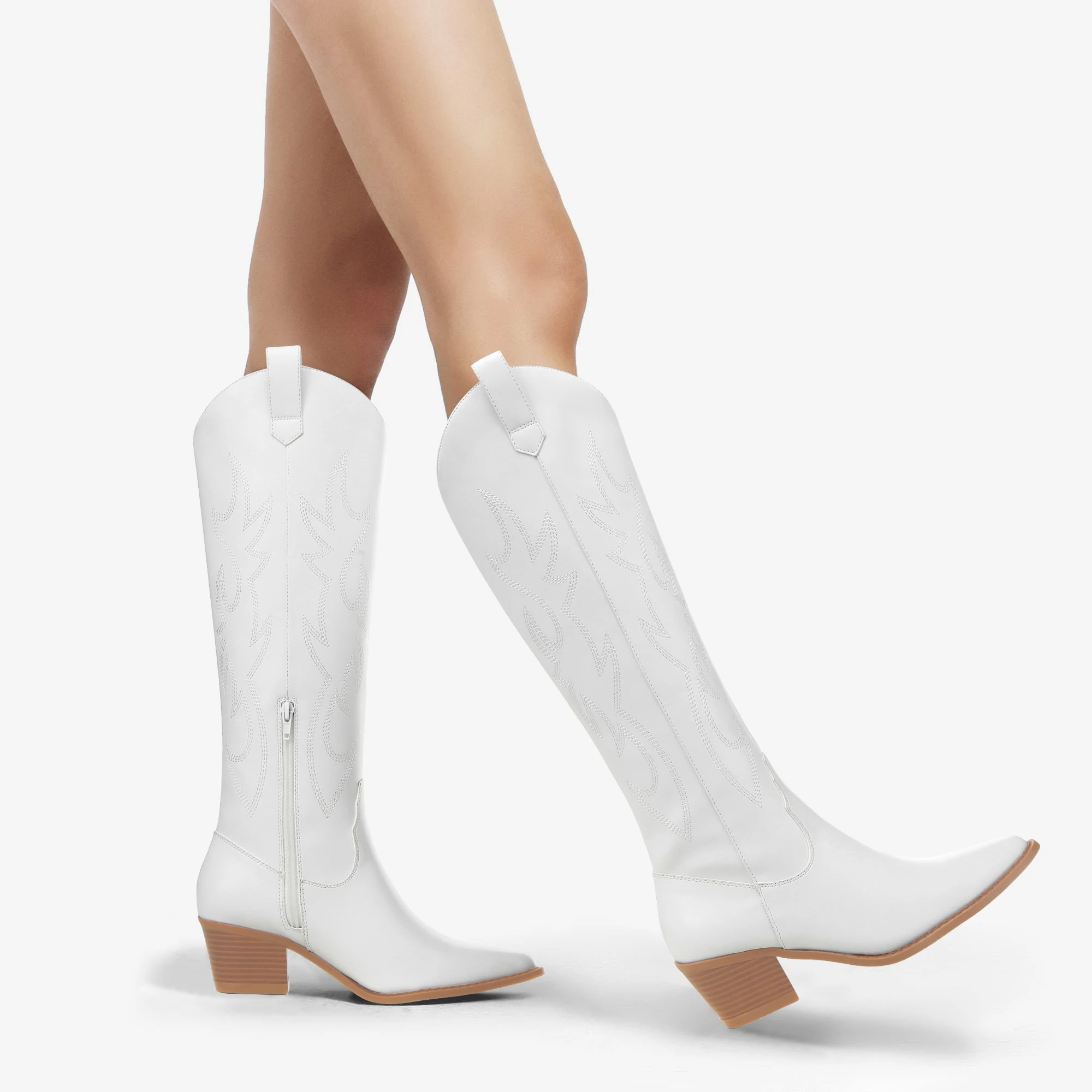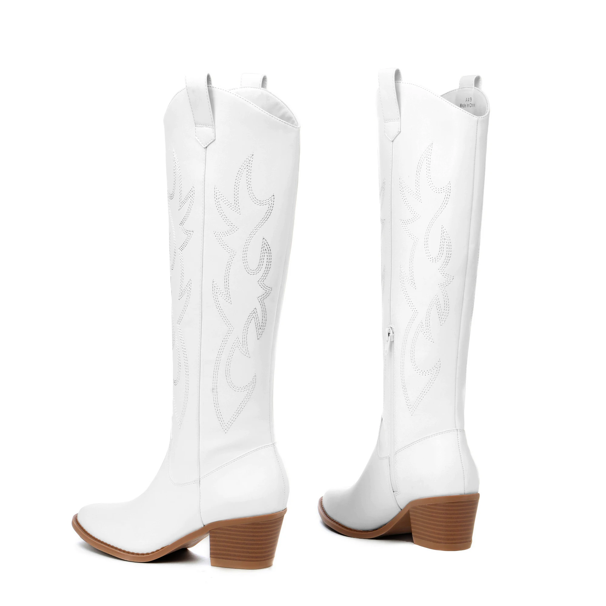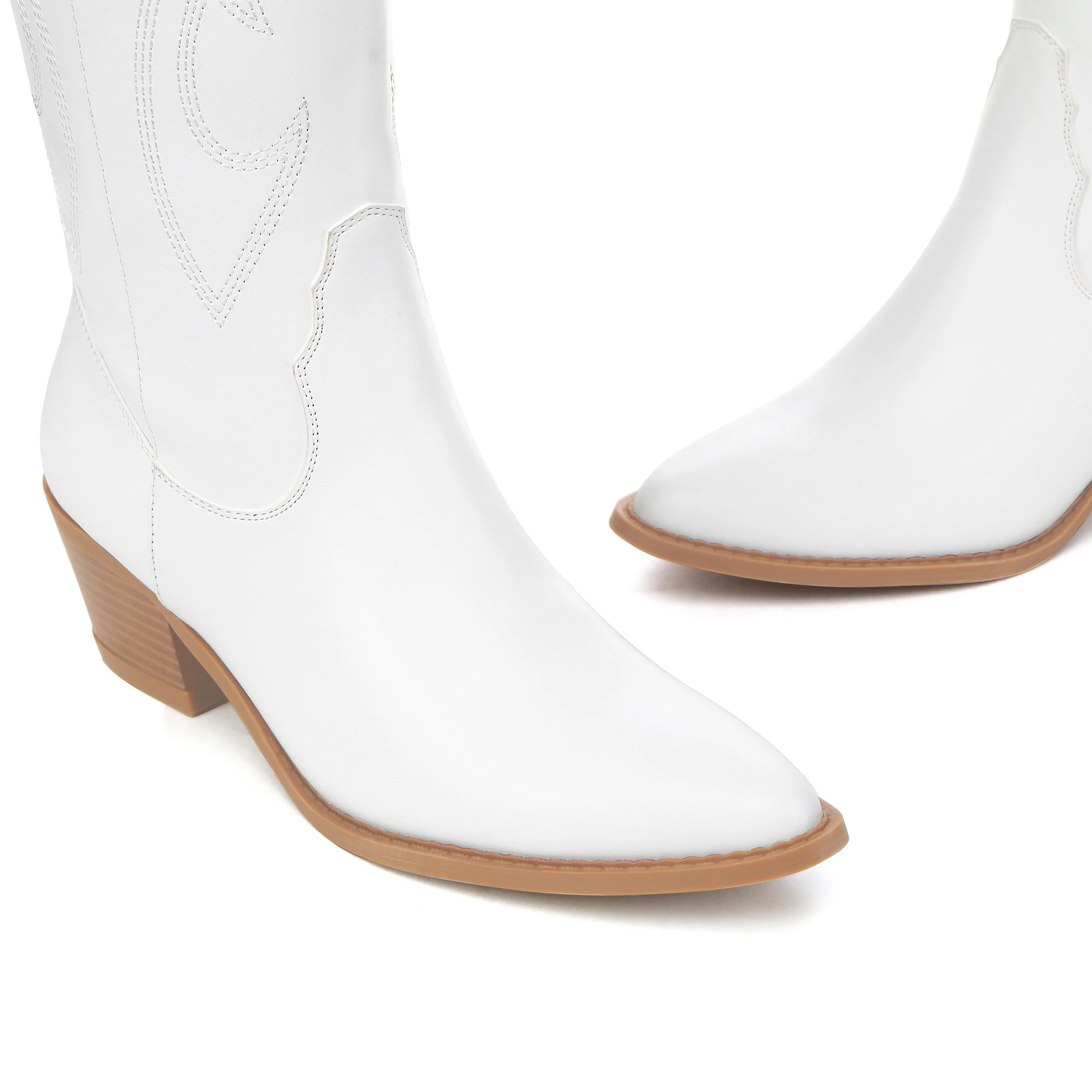 Botas vaqueras bordadas de tacón alto para mujer, botines de media pantorrilla con punta puntiaguda, color blanco, talla grande 43, otoño