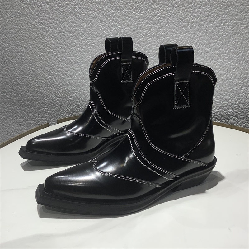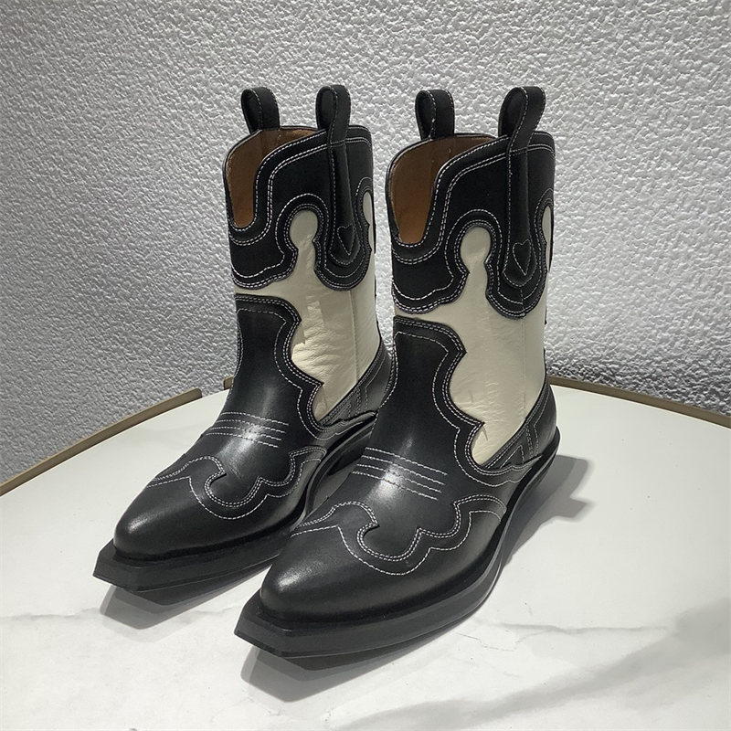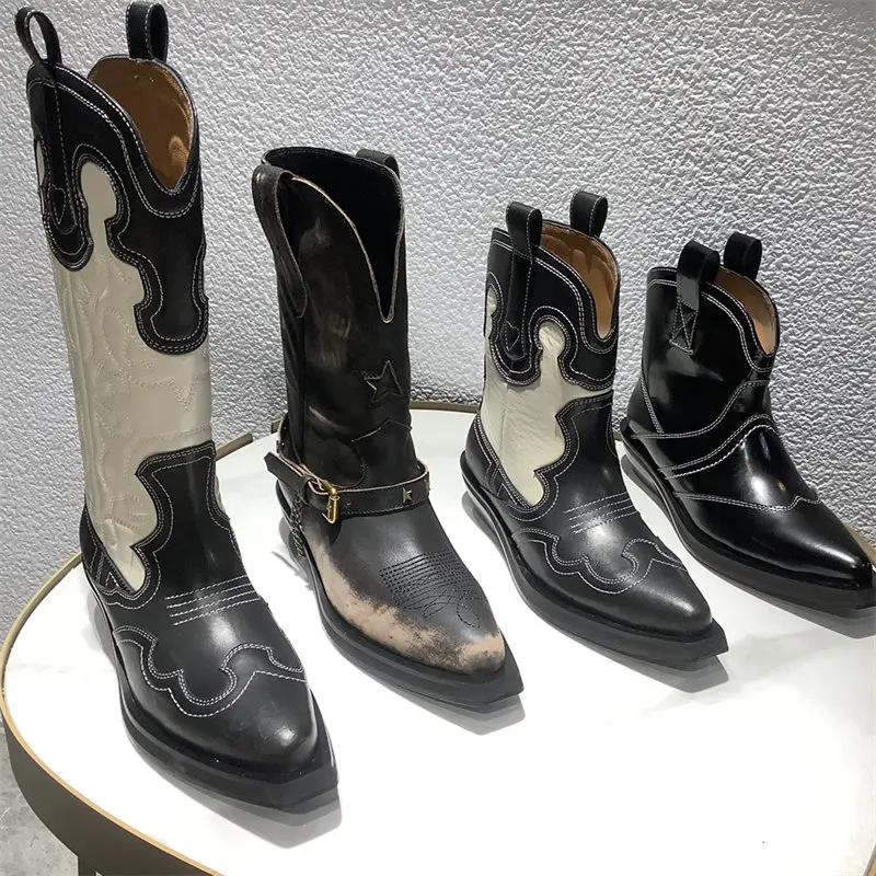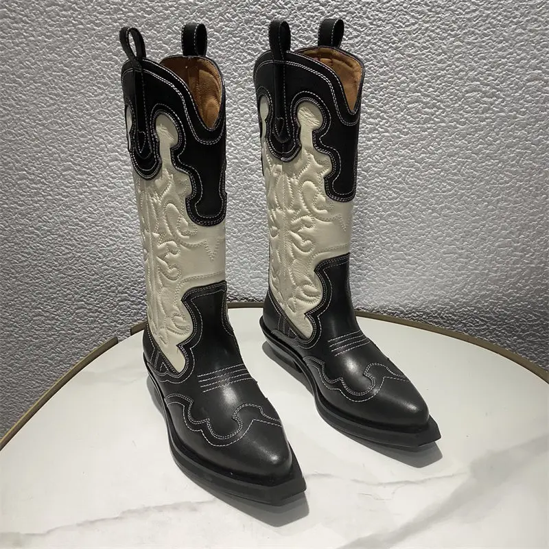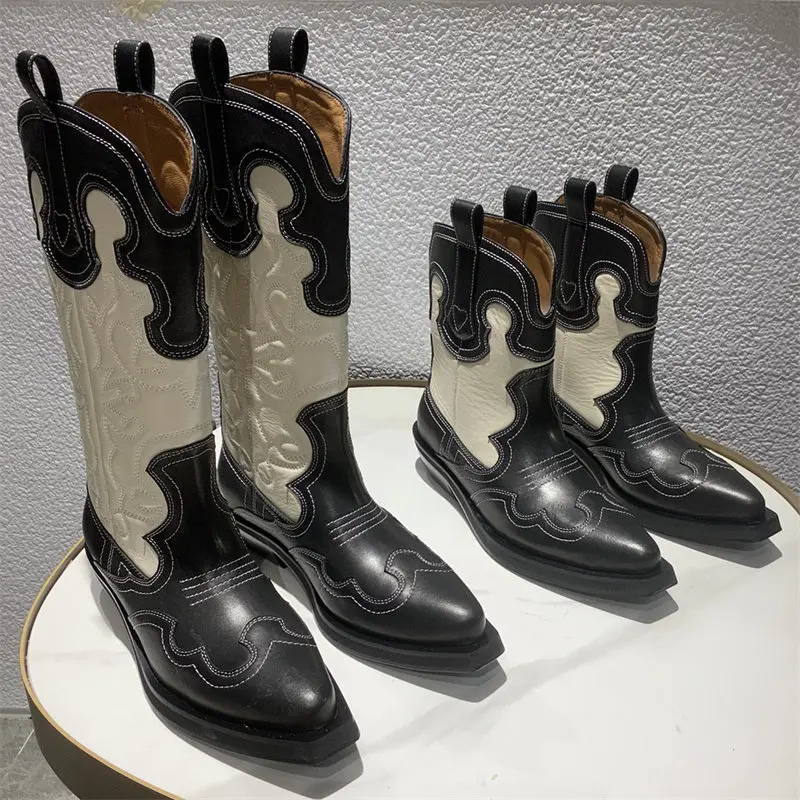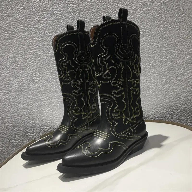 Botas vaqueras bordadas para mujer, zapatos occidentales de media pantorrilla, punta estrecha, tacón grueso, color negro, invierno, 2023