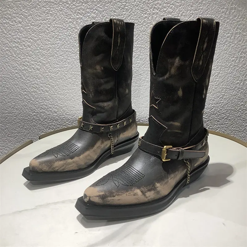 Botas de vaquero Vintage para hombre y Mujer, zapatos Punk de cuero con cadena alta y correa de hebilla, Punta puntiaguda