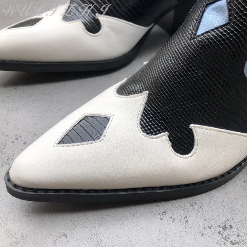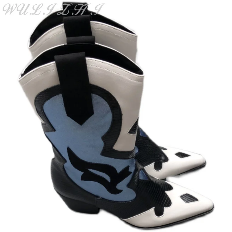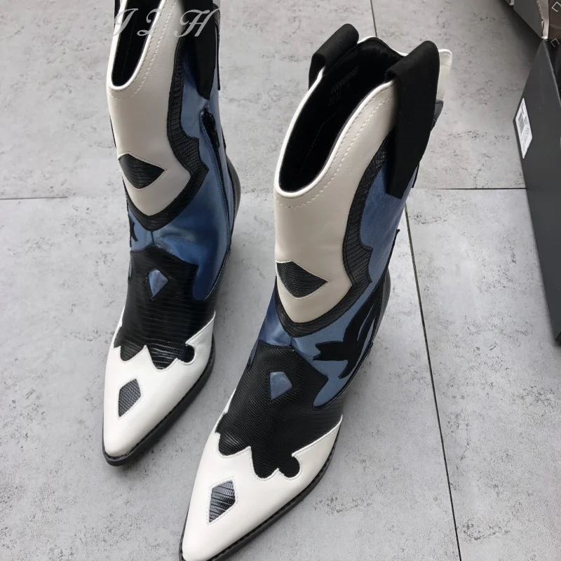 Botas vaqueras de media pantorrilla para mujer, botines occidentales de tacón grueso y Punta puntiaguda, diseño de patrón de moda, colores mezclados, otoño, 2023