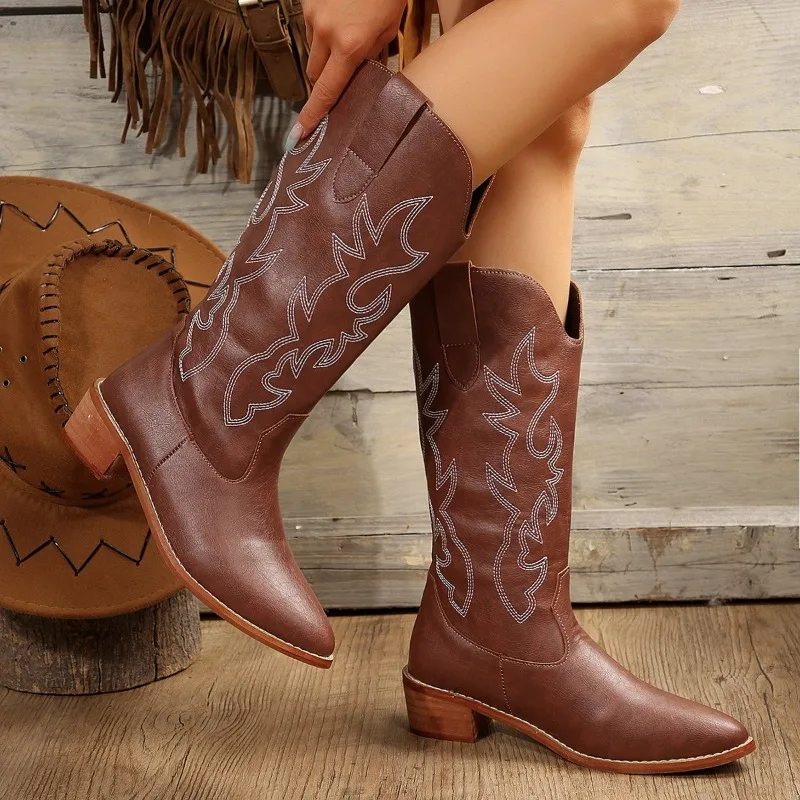 Botas vaqueras bordadas para mujer, zapatos occidentales de media pantorrilla, punta estrecha, tacón grueso, color negro, invierno, 2023