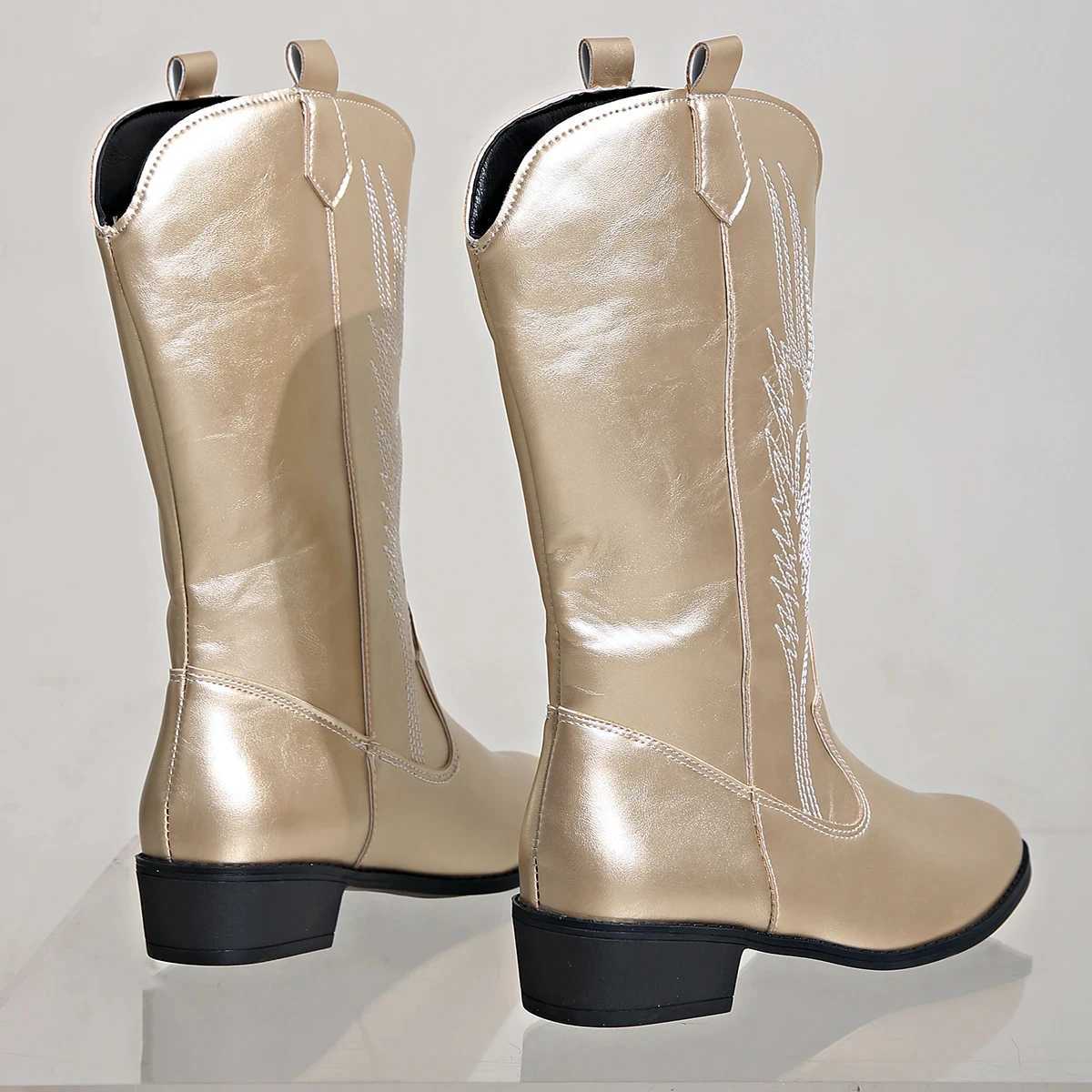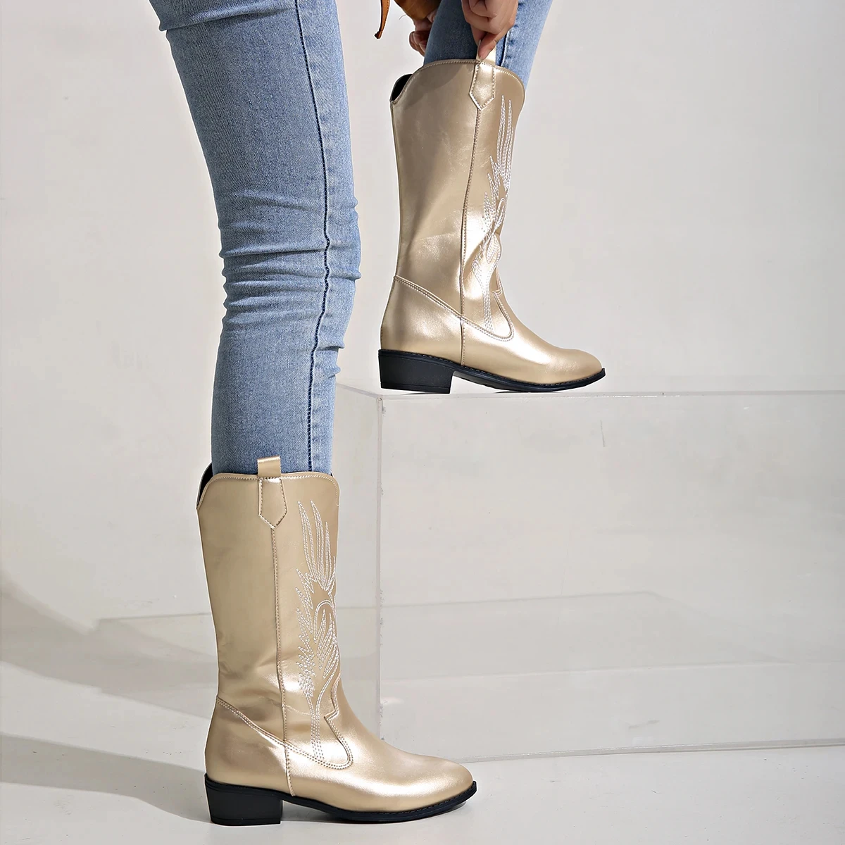 Botas vaqueras occidentales bordadas doradas para mujer, zapatos de media pantorrilla sin cordones, Punta puntiaguda, tacones bajos, moda de otoño, nuevo