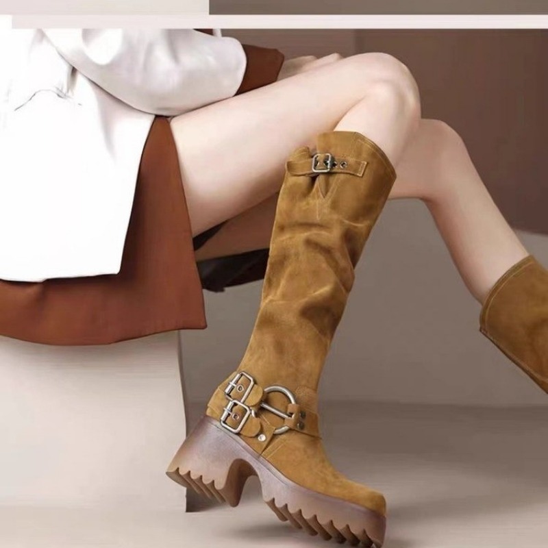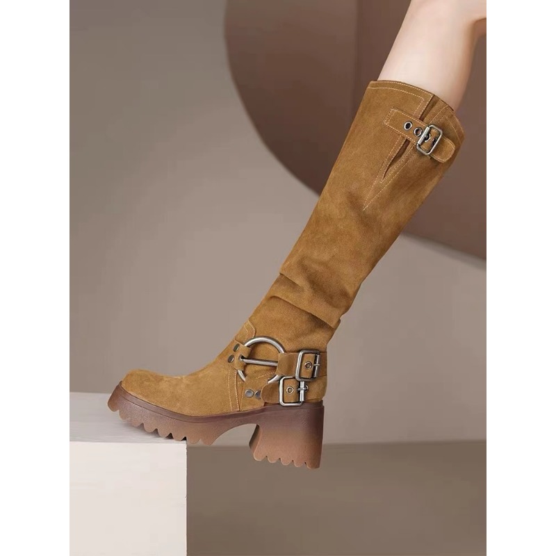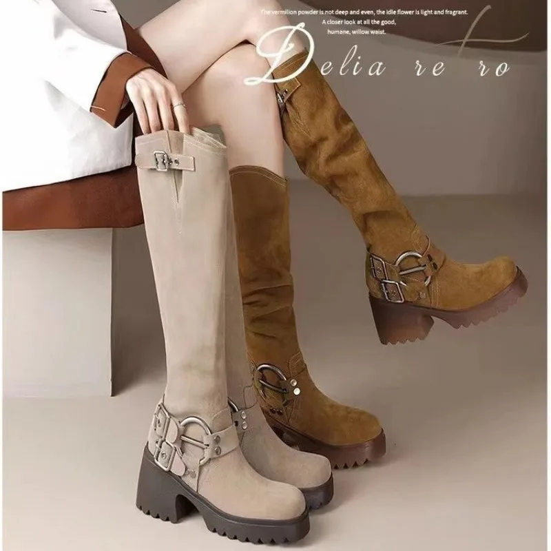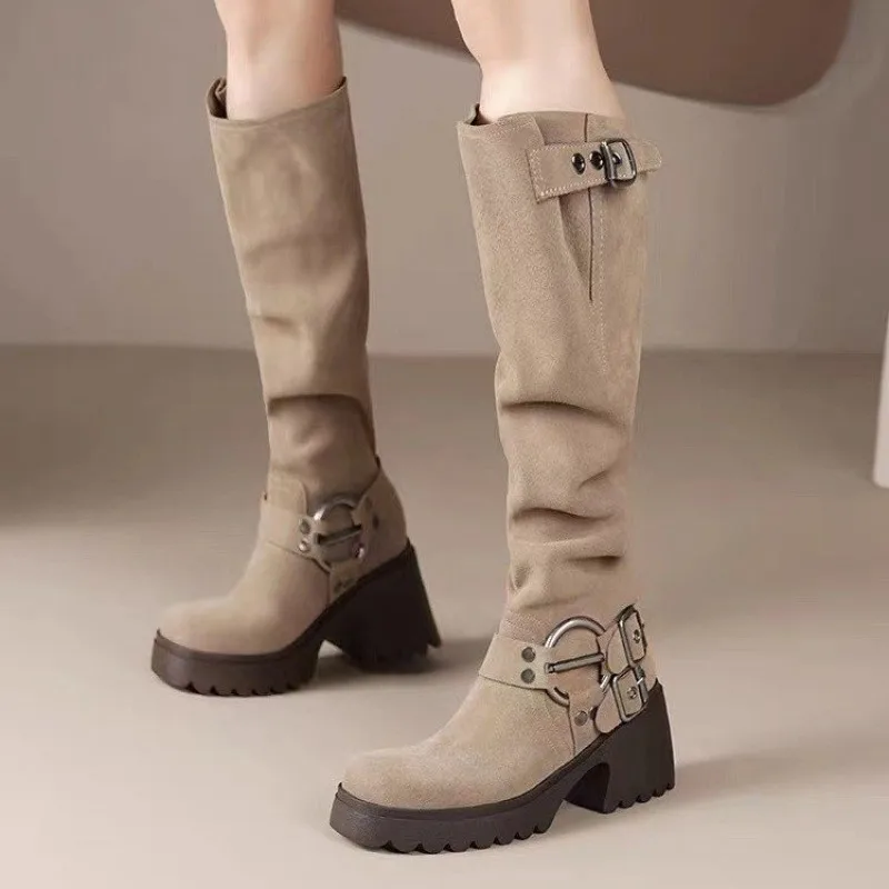 Botas vaqueras de ante para mujer, zapatos de tacón bajo, punta redonda, hebilla de Metal, cremallera lateral, talla grande, a la moda, 2023