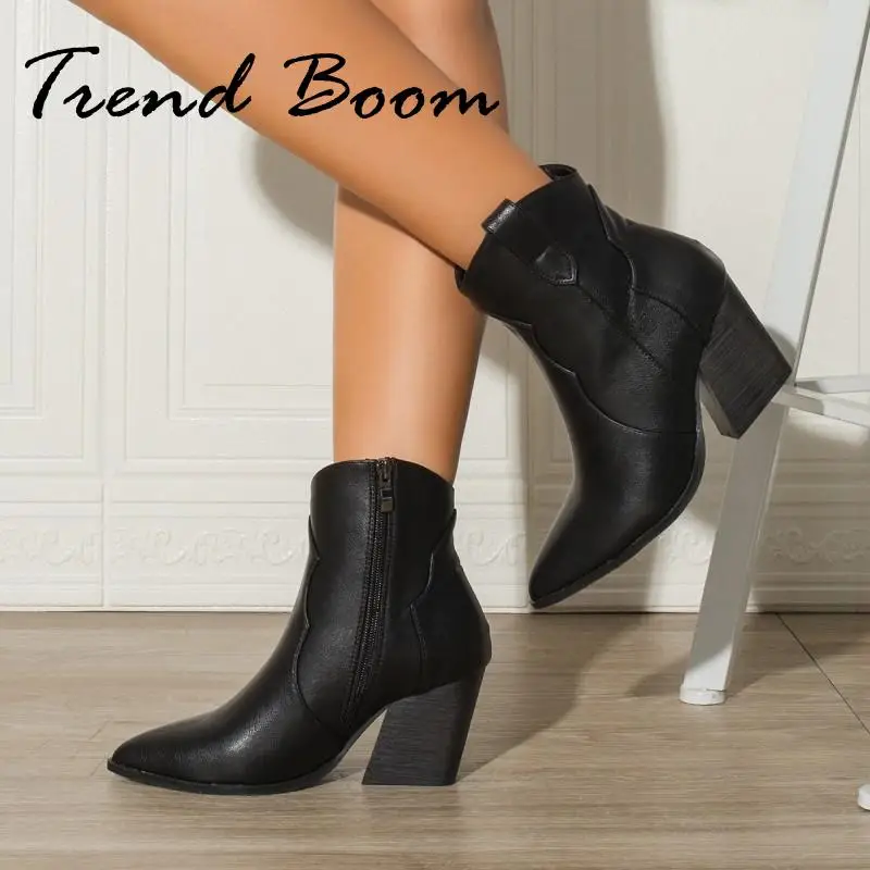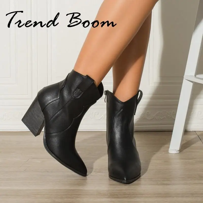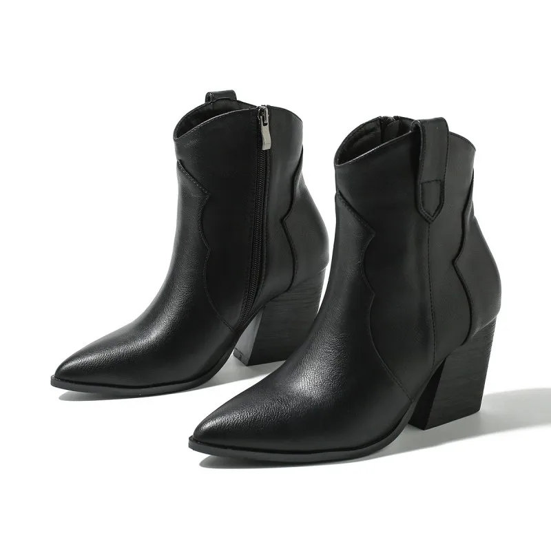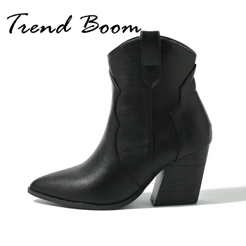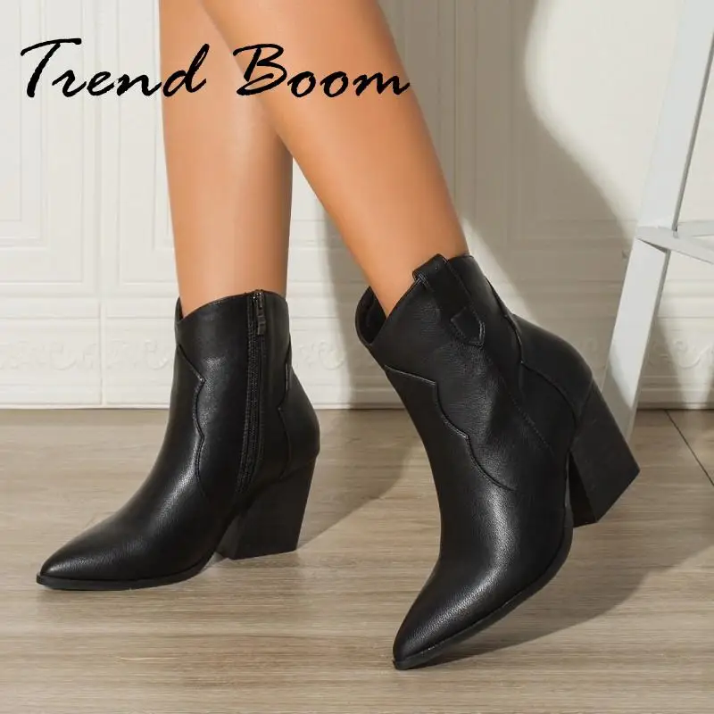 Botas vaqueras bordadas para mujer, zapatos occidentales de media pantorrilla, punta estrecha, tacón grueso, color negro, invierno, 2023