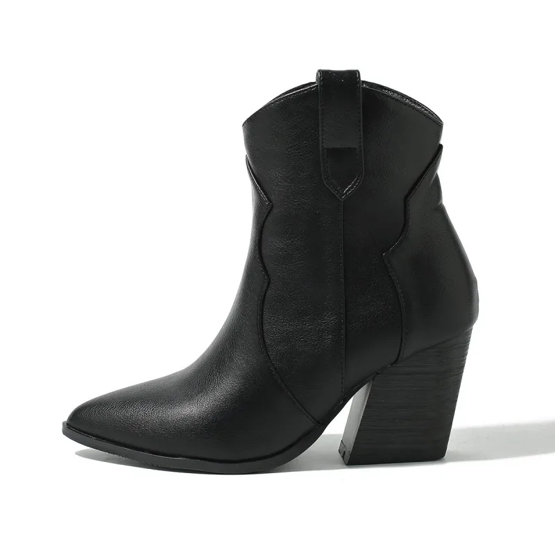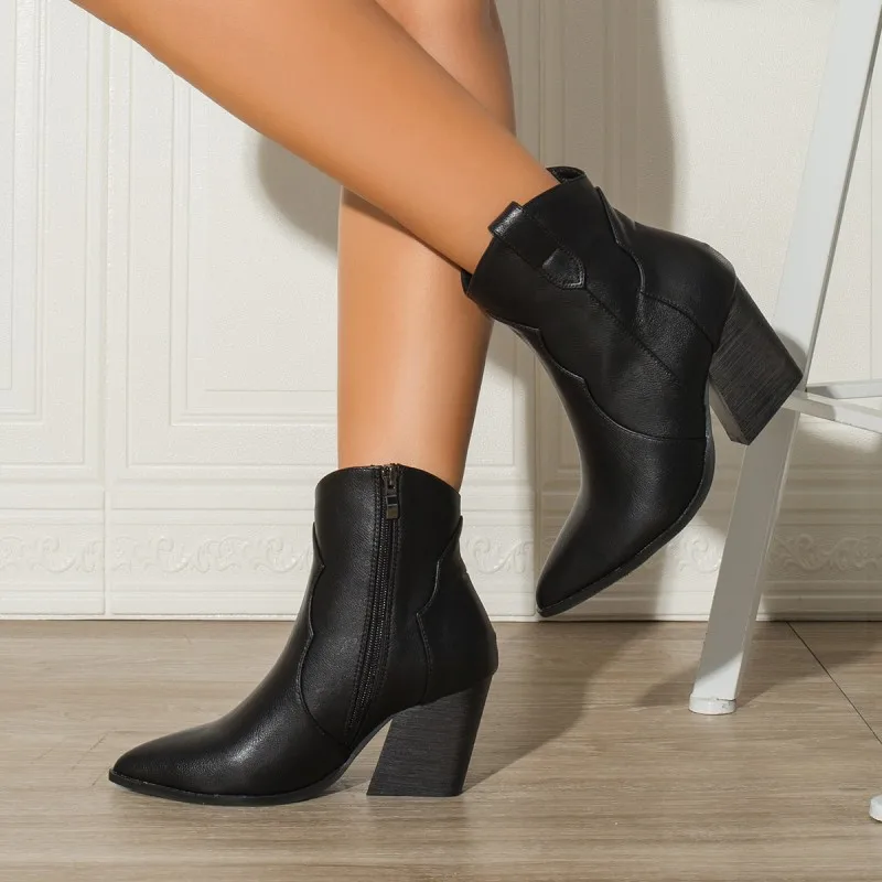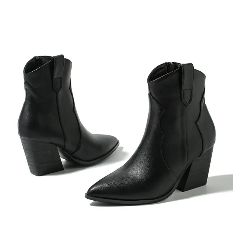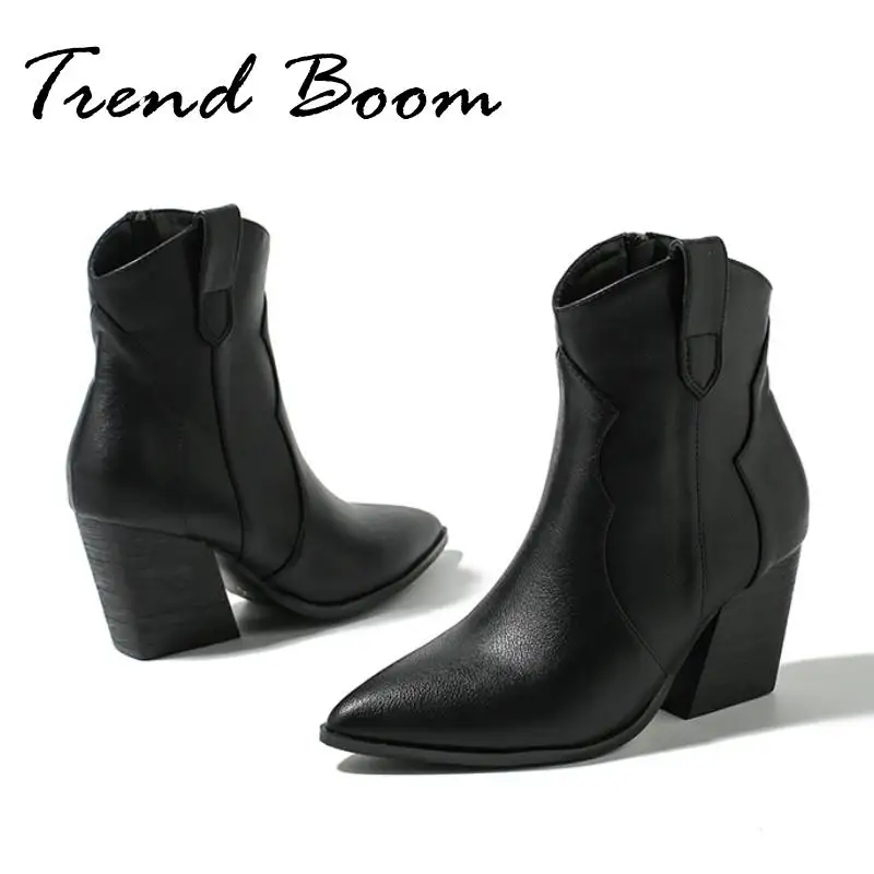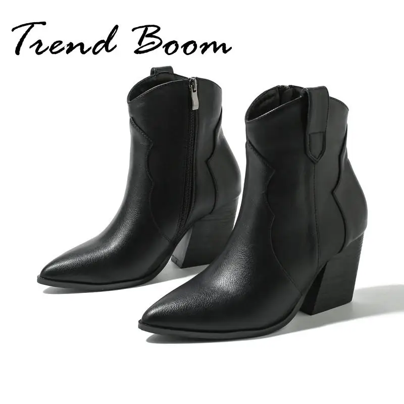 Botas vaqueras bordadas para mujer, zapatos occidentales de media pantorrilla, punta estrecha, tacón grueso, color negro, invierno, 2023