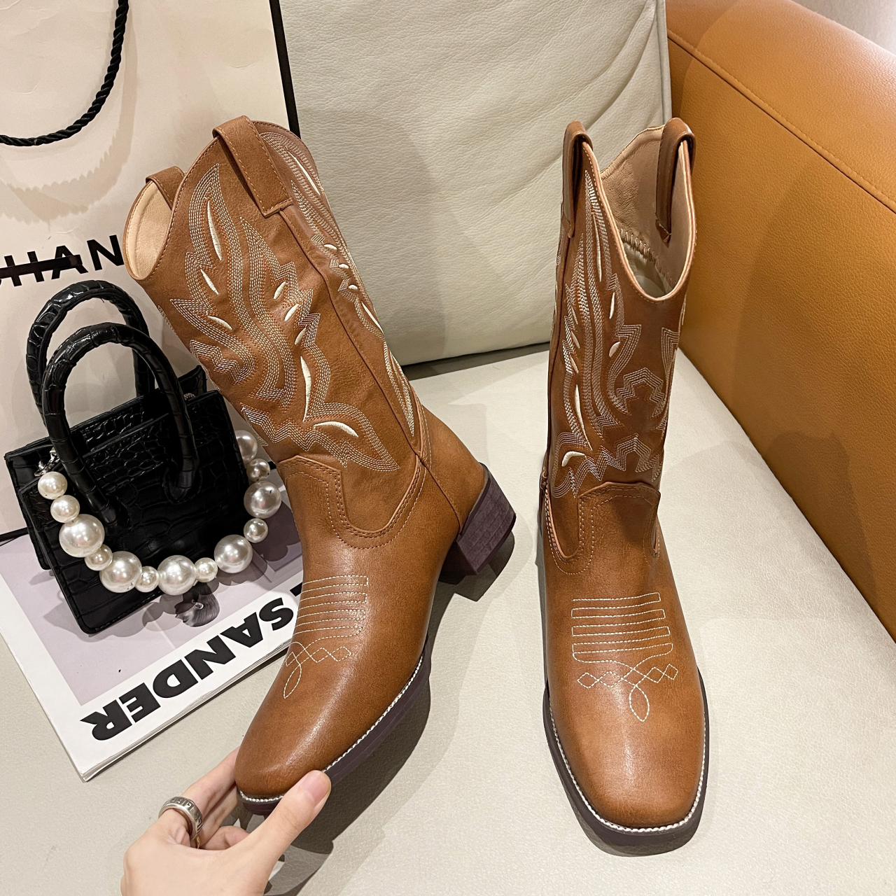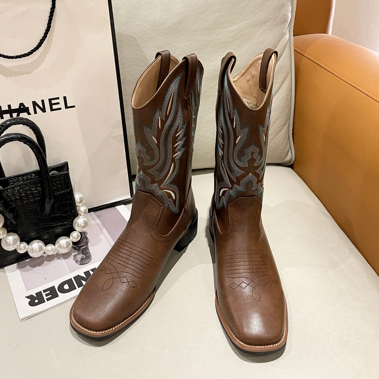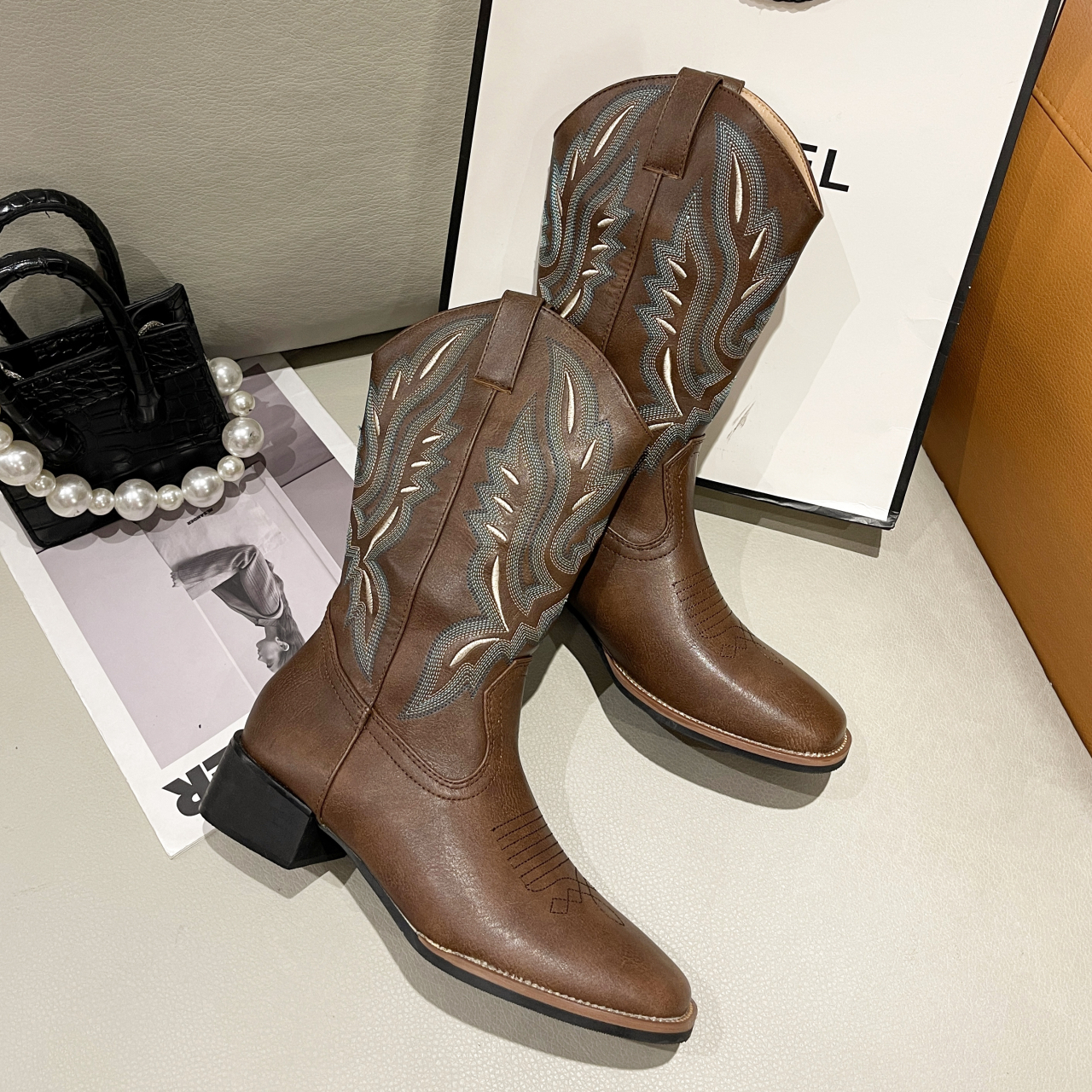 Botas vaqueras bordadas para mujer, zapatos occidentales de media pantorrilla, punta estrecha, tacón grueso, color negro, invierno, 2023