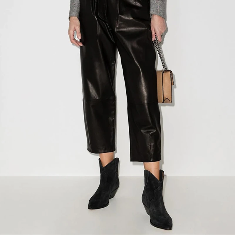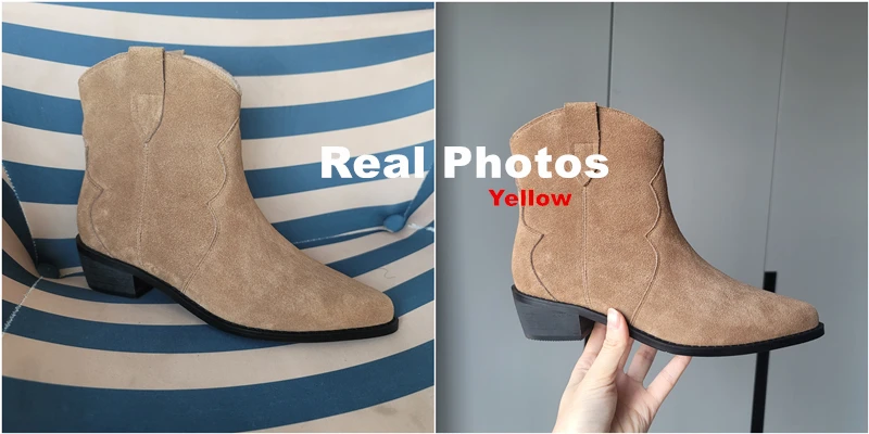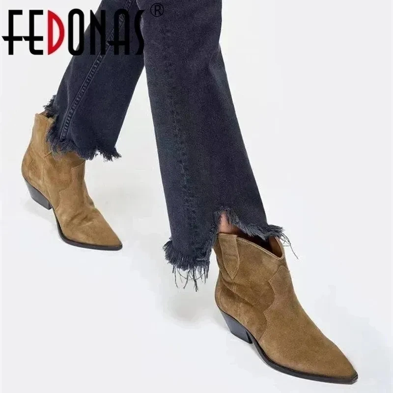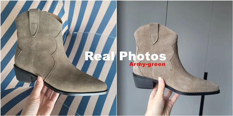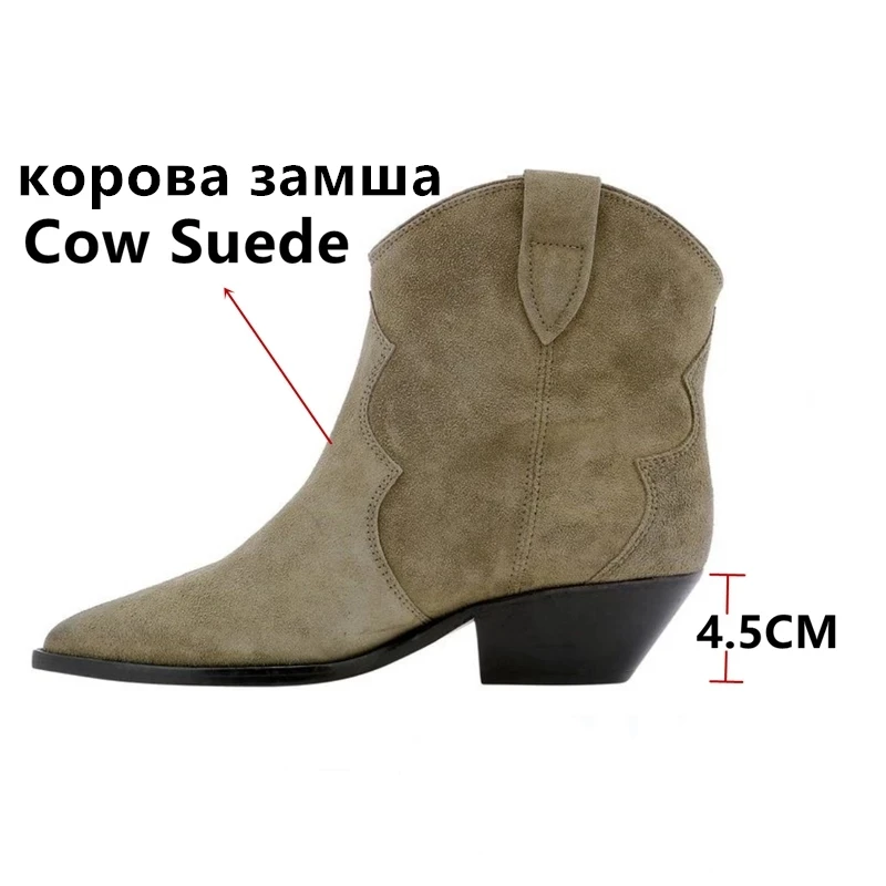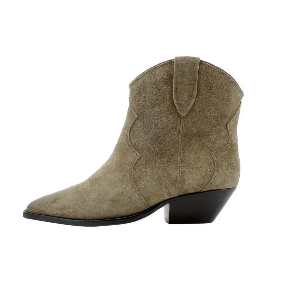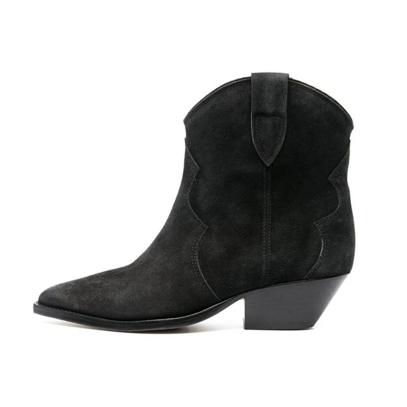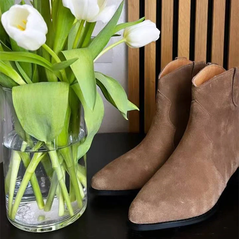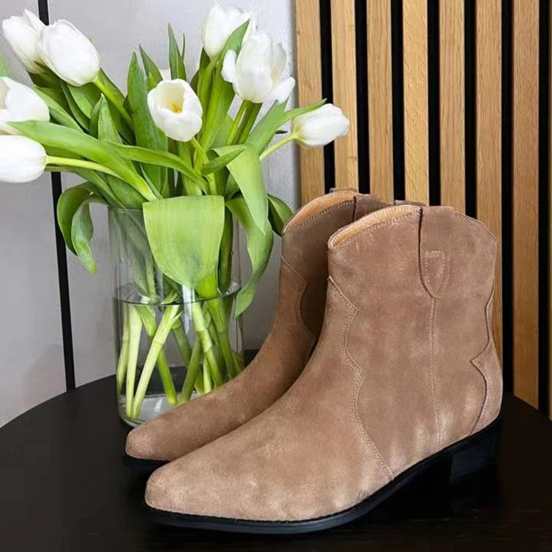 Botas vaqueras de ante para mujer, zapatos de tacón bajo, punta redonda, hebilla de Metal, cremallera lateral, talla grande, a la moda, 2023