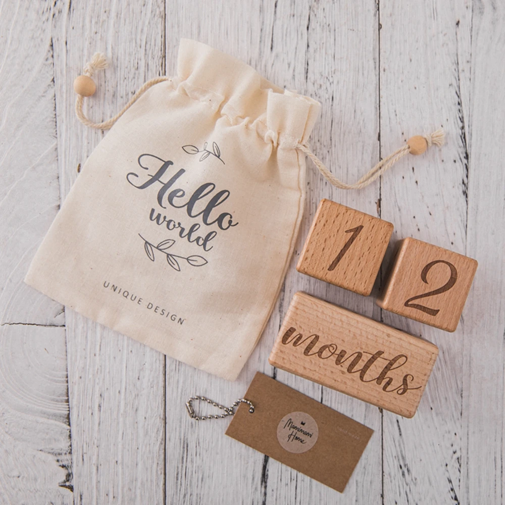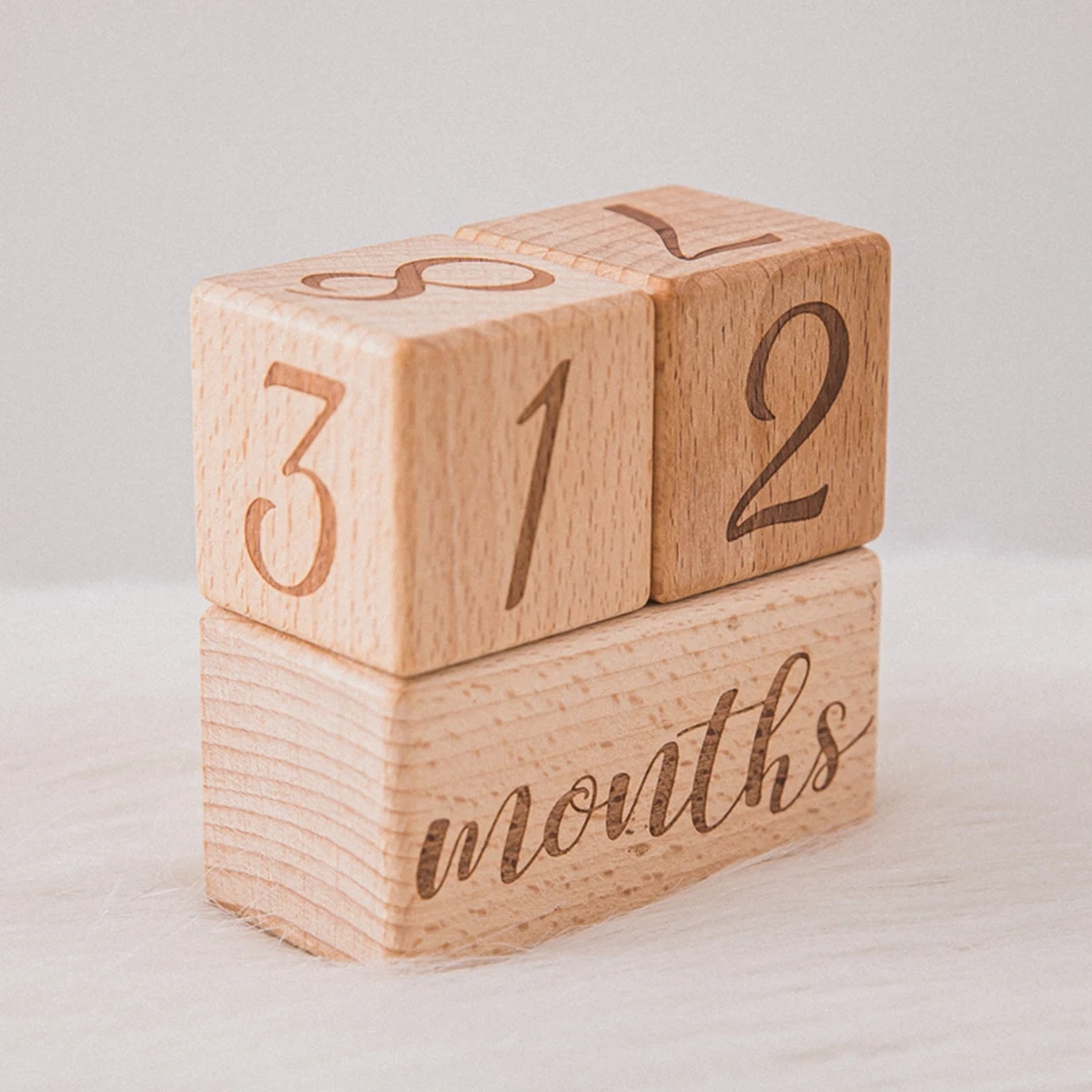1 Juego de tarjeta de hito del mes del bebé bloque de haya cuadrado grabado recién nacido nacimiento mes cumpleaños hitos bloque accesorios de fotografía