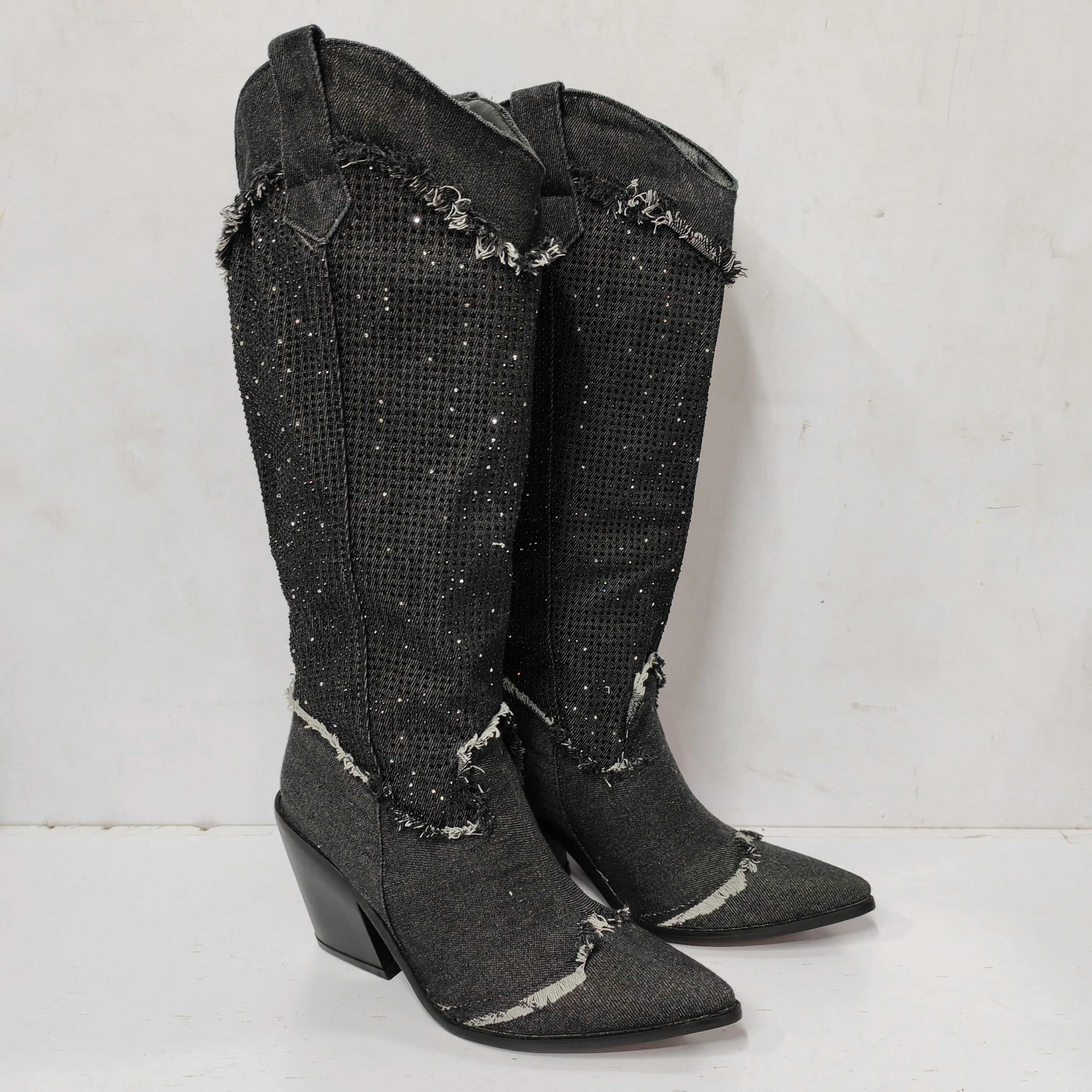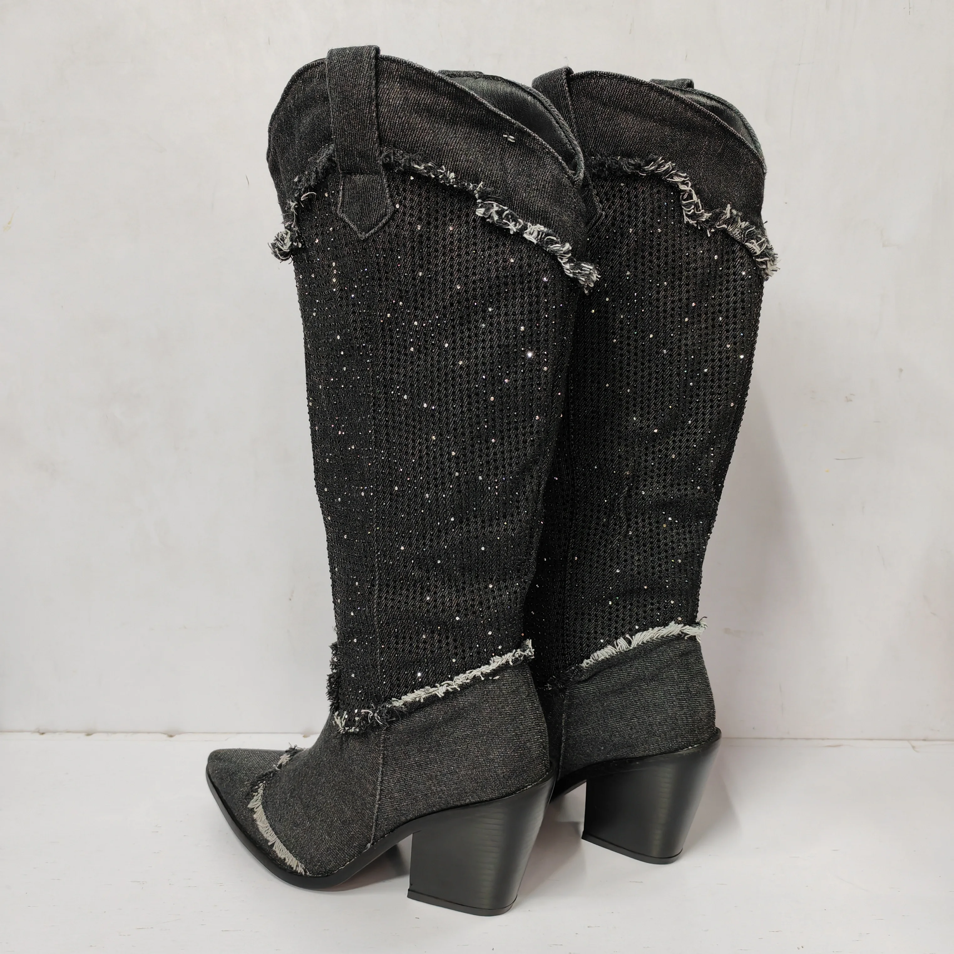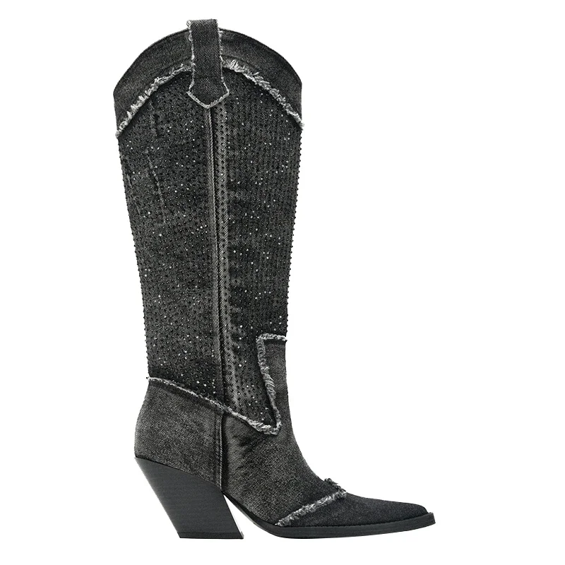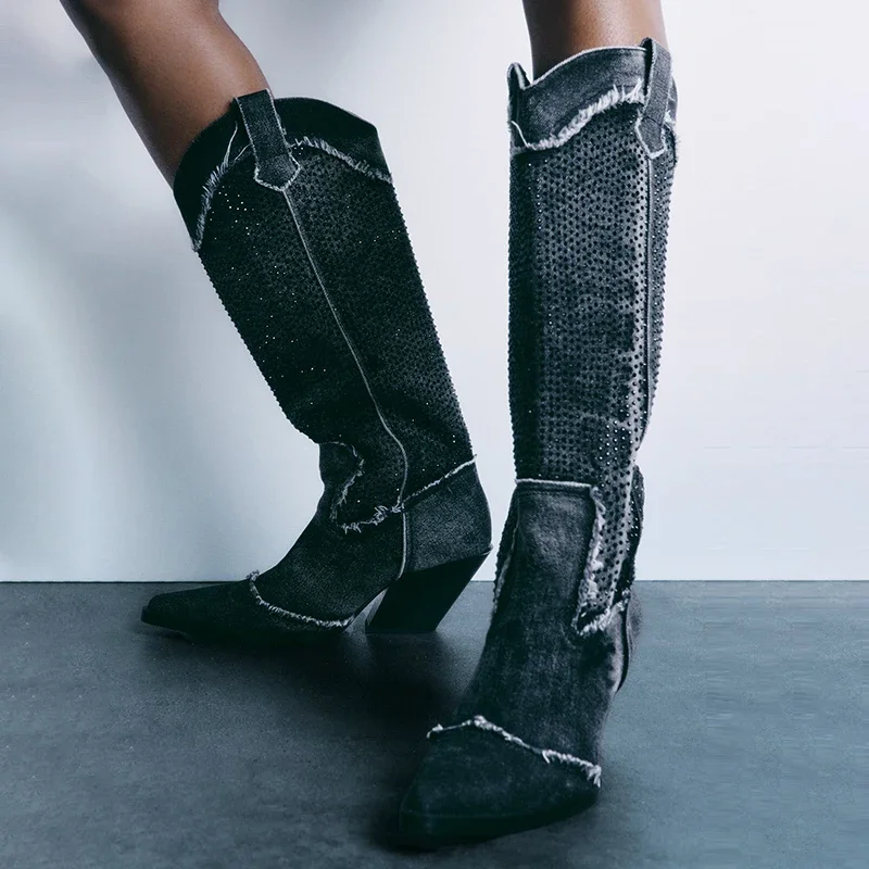 ZA-Botas de vaquero hasta la rodilla para mujer, botines de diseñador de lujo con diamantes de imitación, estilo occidental, novedad de primavera, 2024, envío gratis