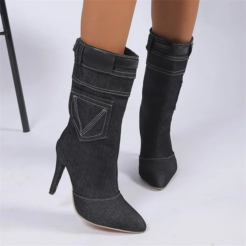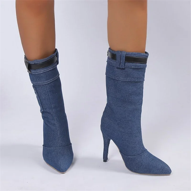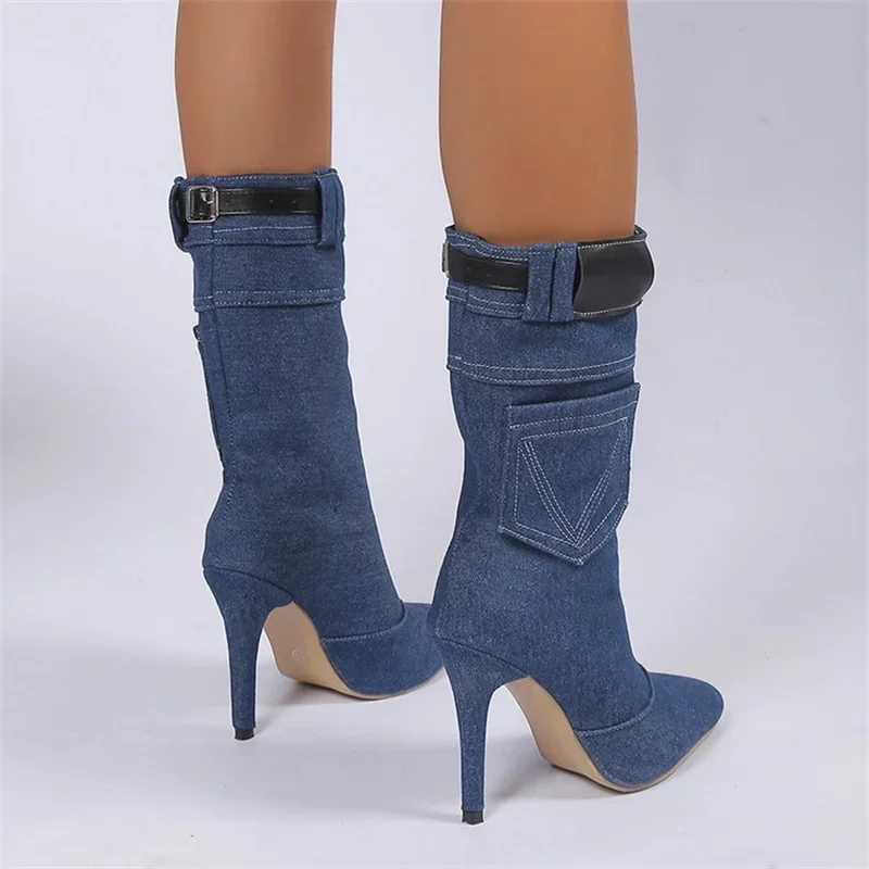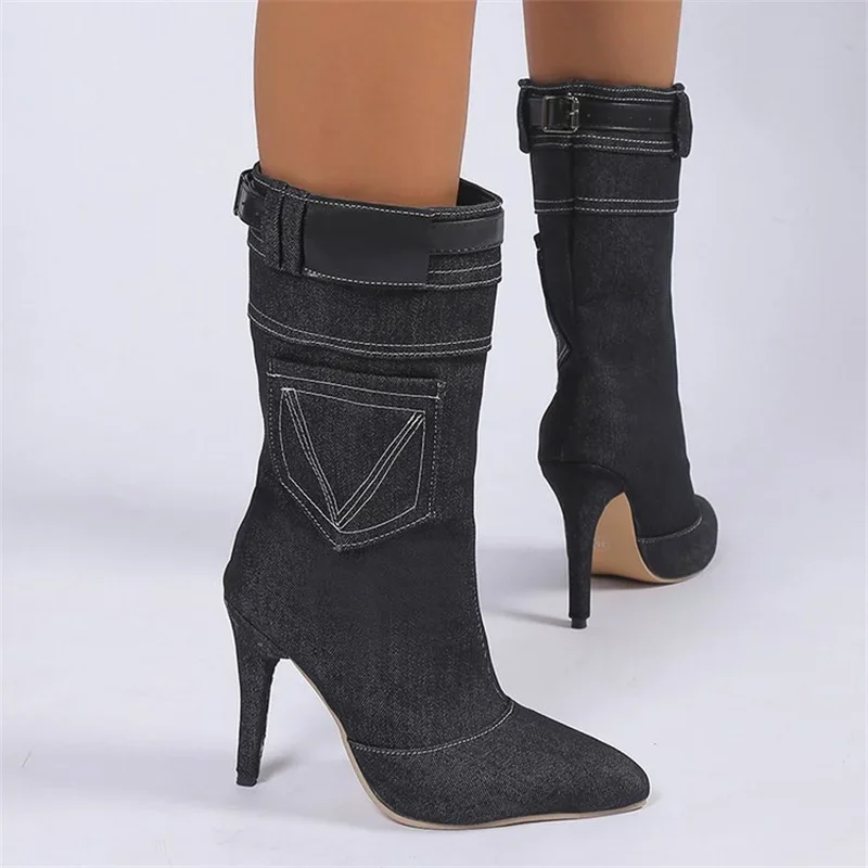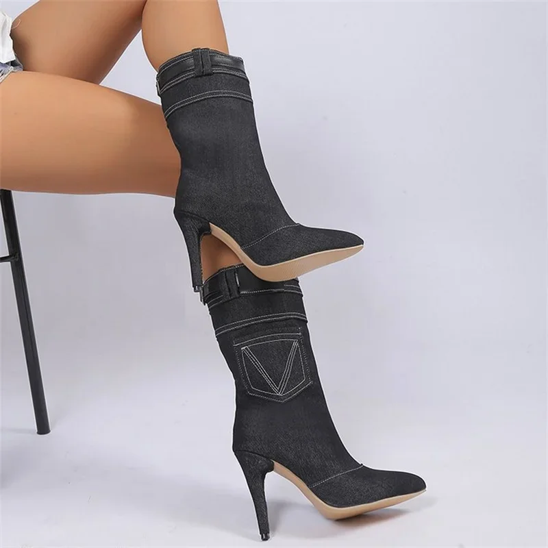 Zapatos con hebilla De cinturón para Mujer, botas De Punta puntiaguda con cremallera, botas vaqueras De tacón alto, invierno, 2023